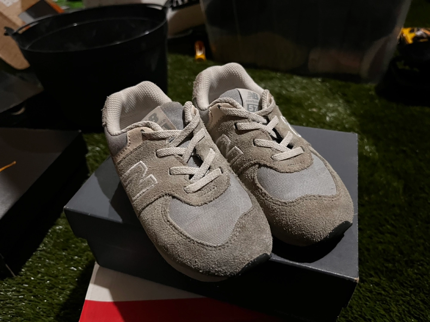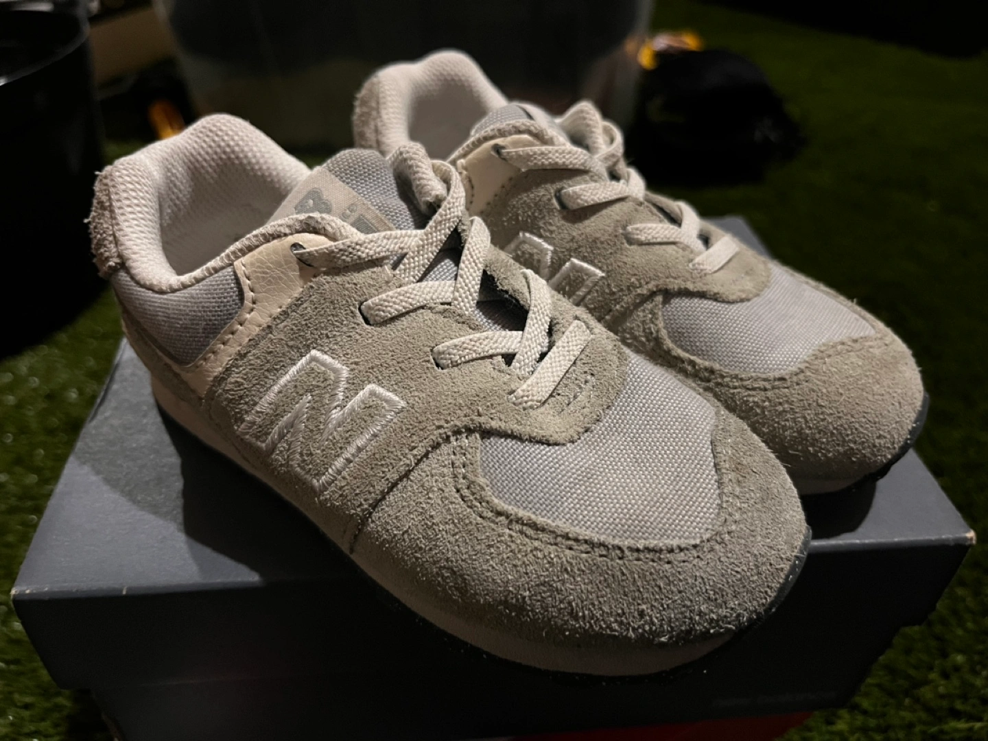 Grey suede sneakers with white accents. Lace-up closure. In good condition.