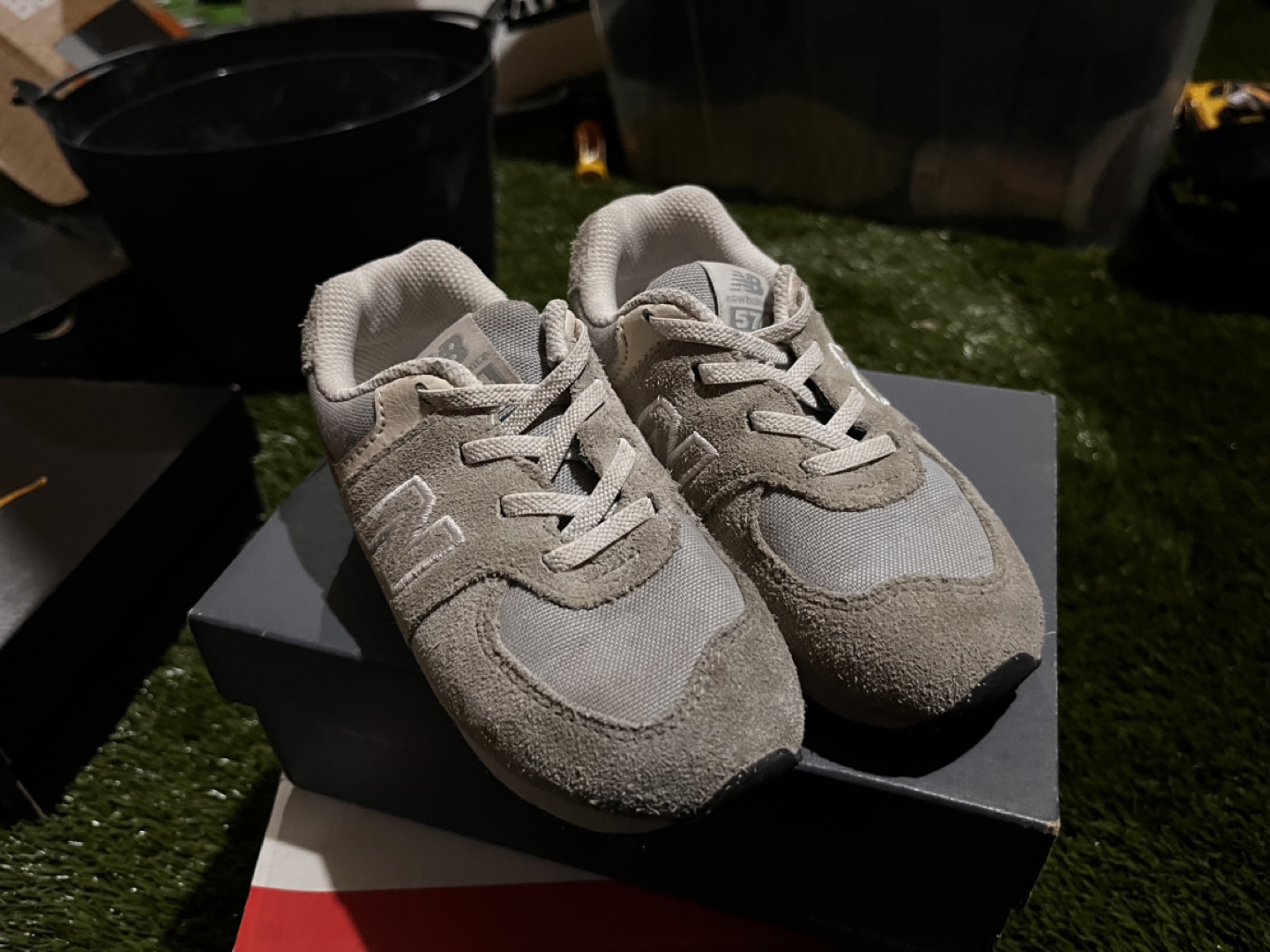 Grey suede sneakers with white accents. Lace-up closure. In good condition.