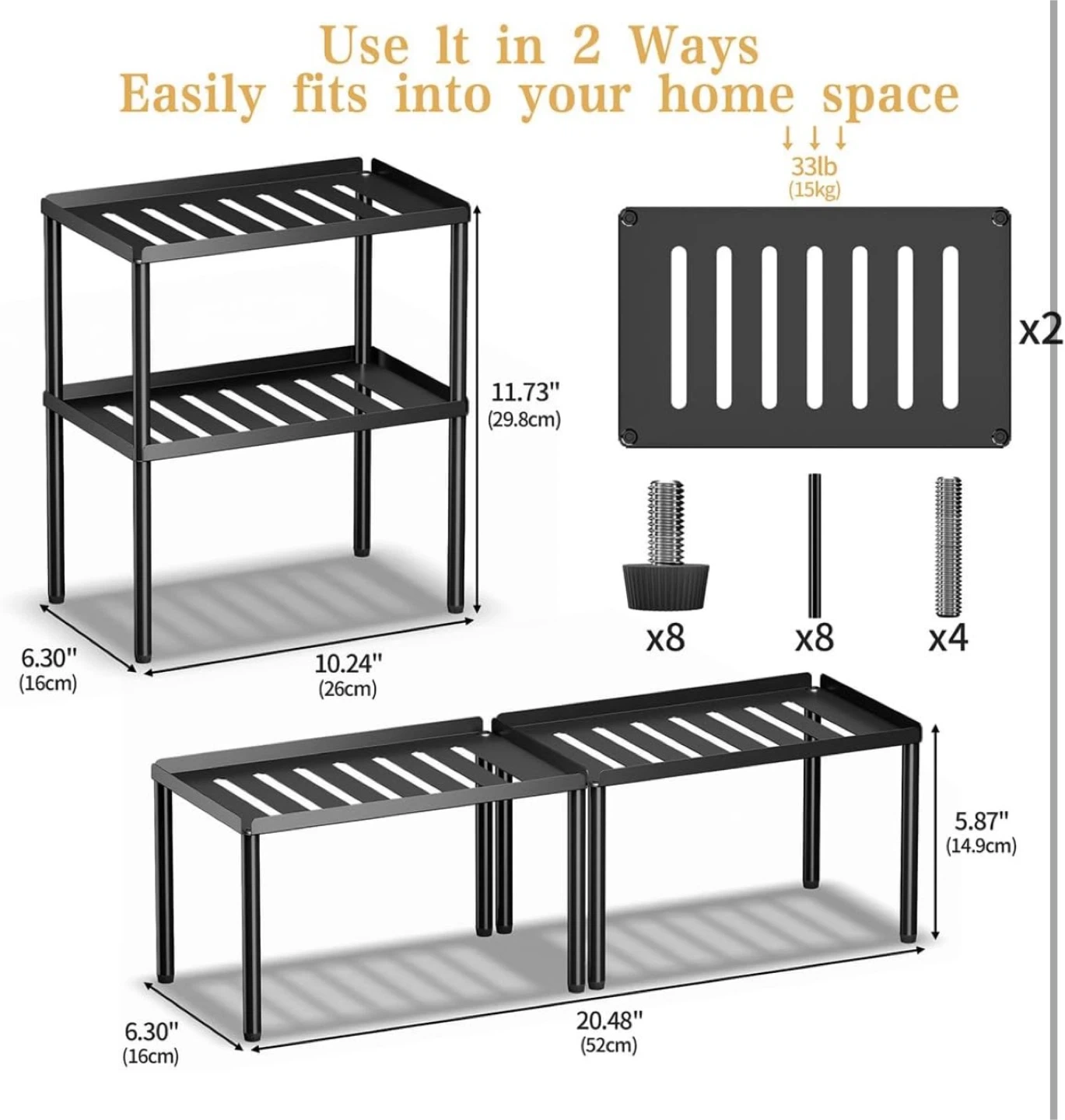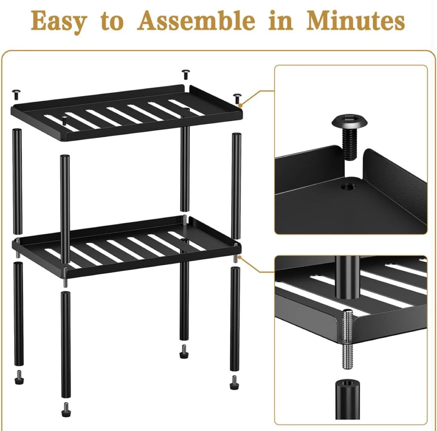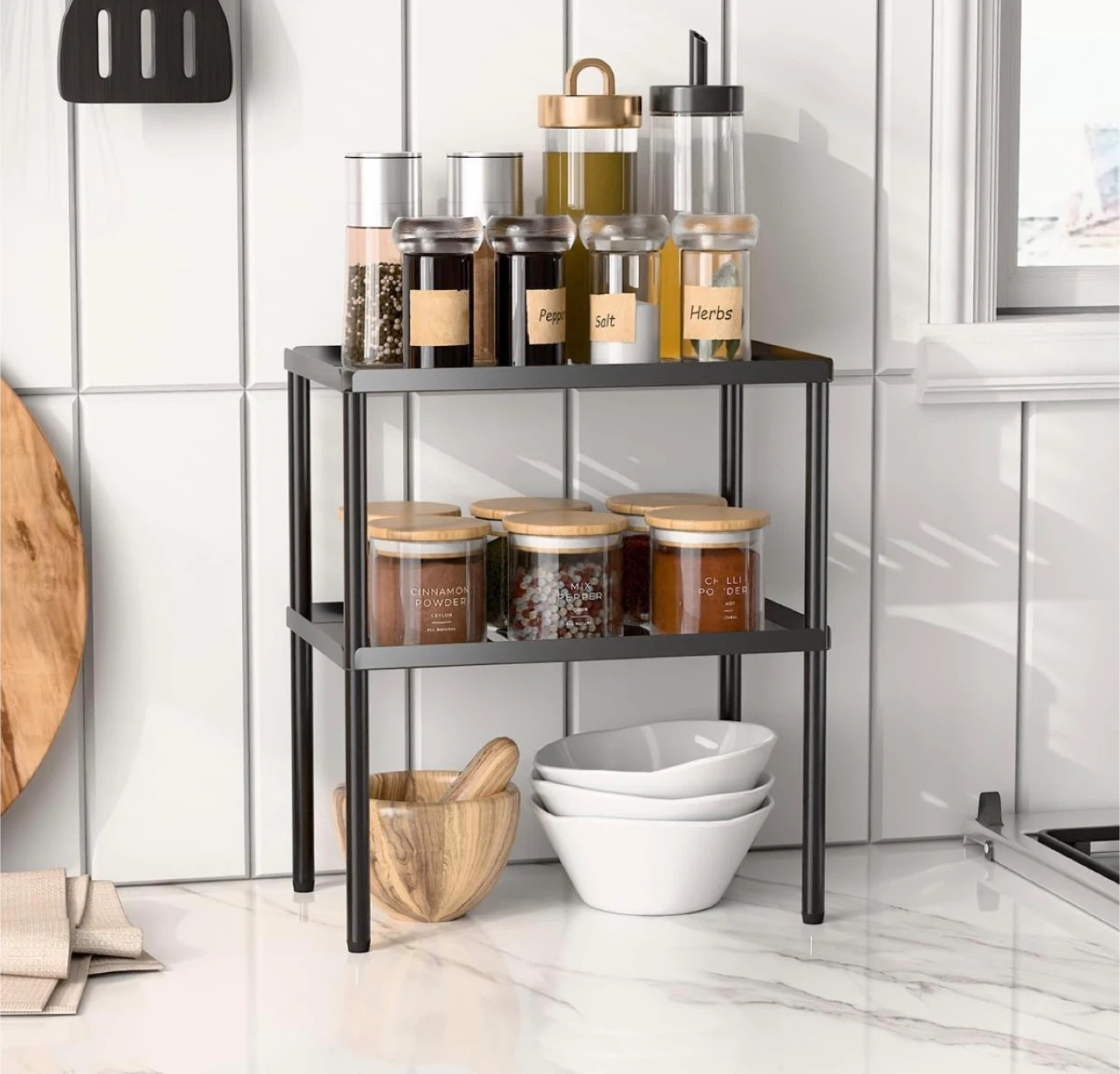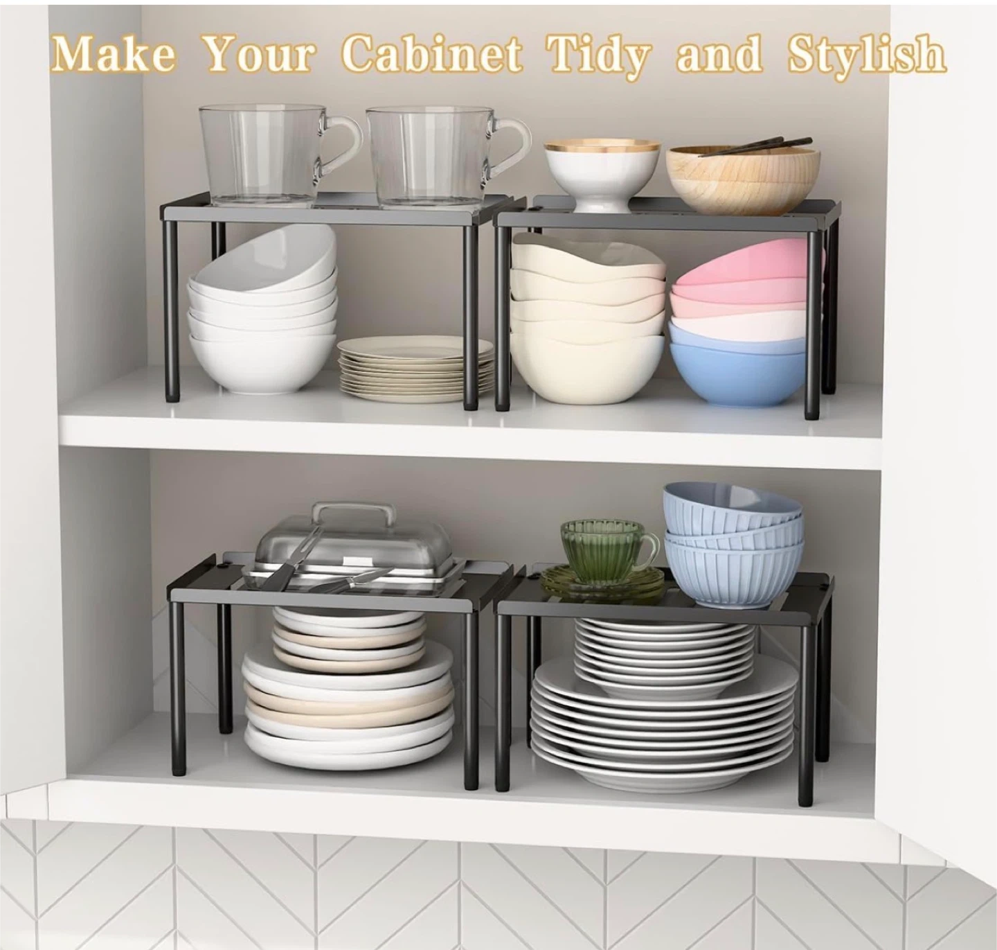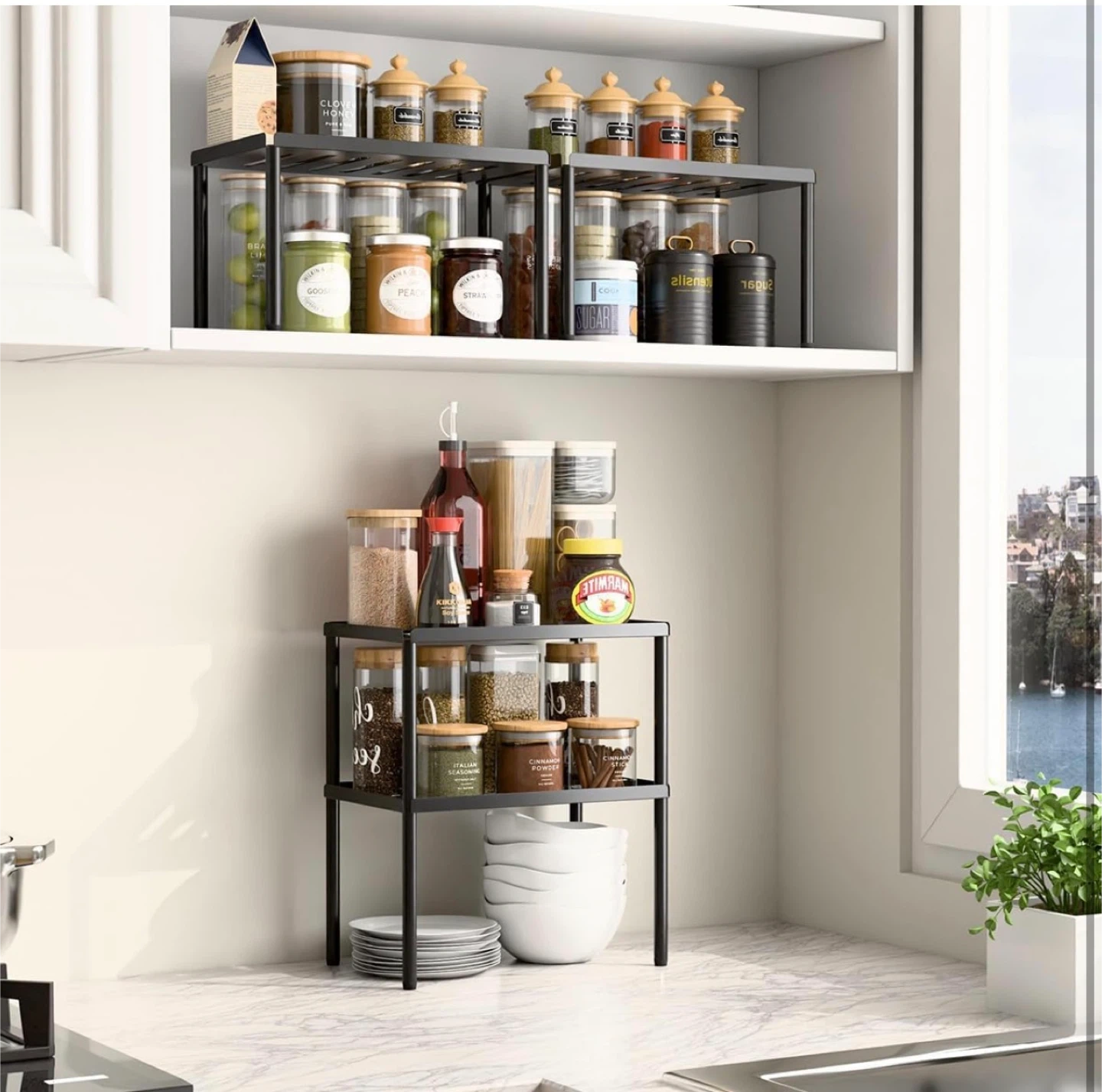 2 Tier Kitchen Cabinet Organizer with Stackable Cabinet Shelves for Kitchen Countertop Storage, Metal Kitchen Shelf Organizer for Spice, Pantry & Under Sink