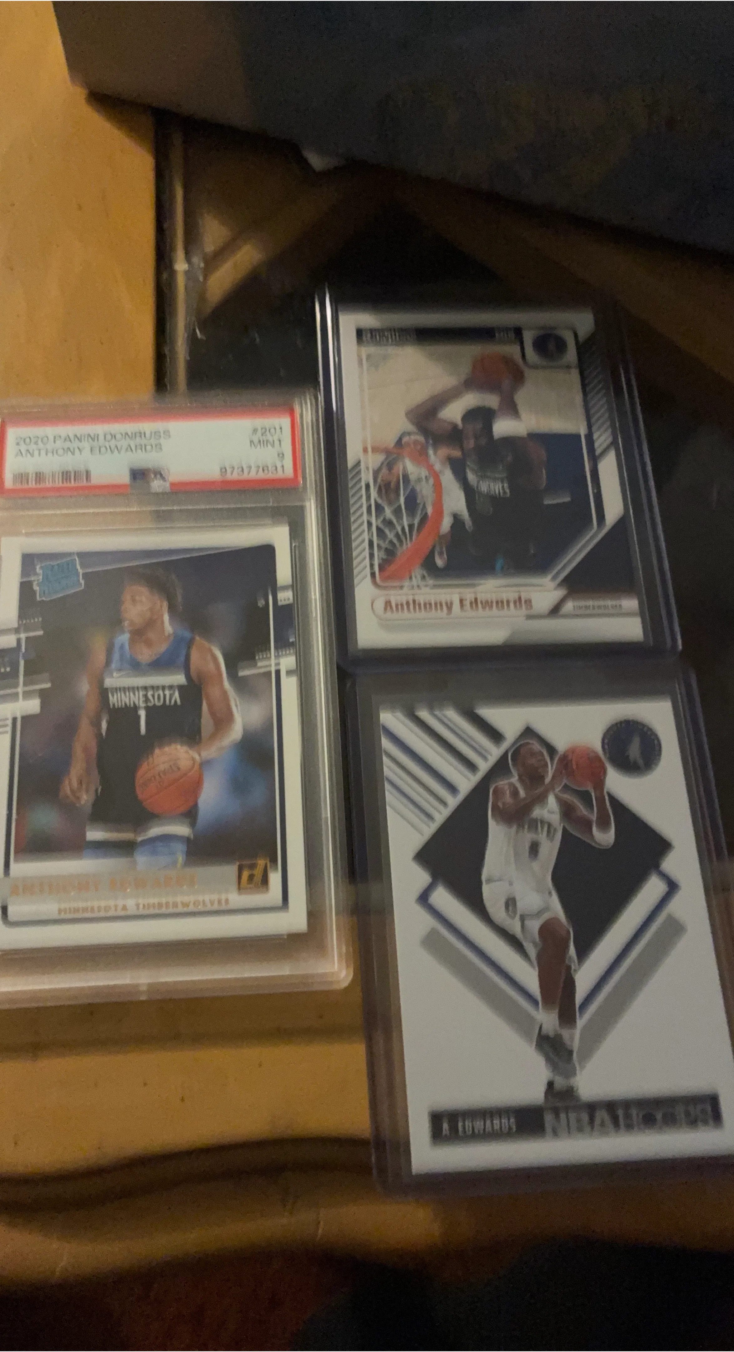 This is a 2020 Panini Donruss card of Anthony Edwards. It's graded PSA 9. The card features Anthony Edwards in his Minnesota Timberwolves uniform.
