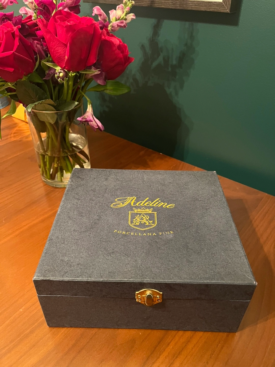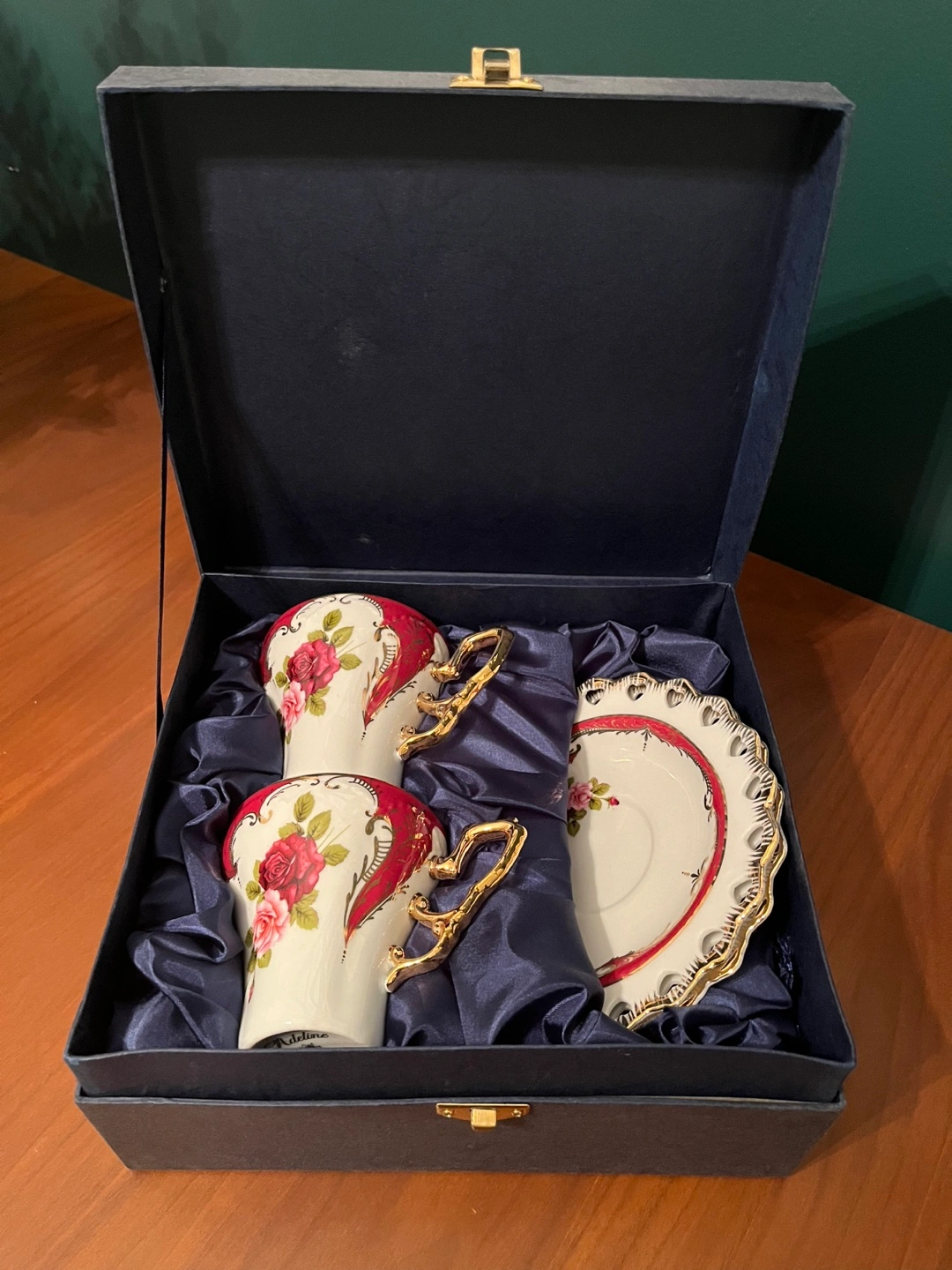 Elegant tea cup and saucer set. Features a beautiful rose design. Gold accents. Comes in original box. Two cups and saucers included.