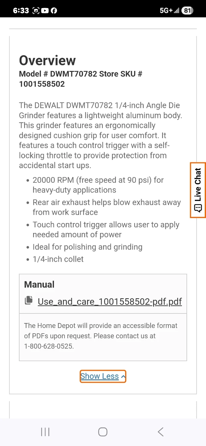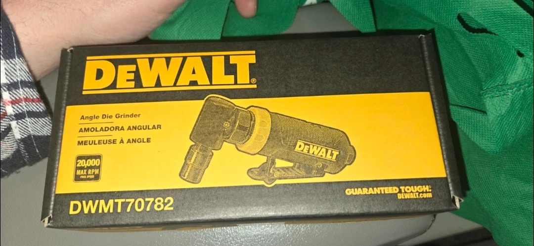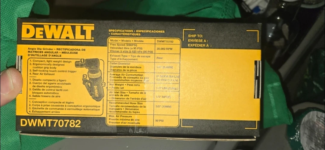 This DEWALT DWMT70782 1/4-inch Angle Die Grinder has a lightweight aluminum body and features an ergonomically designed cushion grip. It has a touch control trigger with a self-locking throttle. Free speed is 20000 RPM and it has a 1/4-inch collet. Rear air exhaust helps blow exhaust away from work surface.