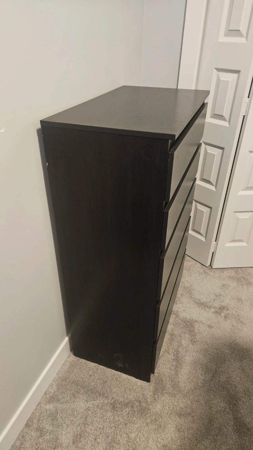 A dark wood dresser with five drawers. It's a great storage solution for any bedroom. The simple design fits most decor styles. Small repair done on one crossbar but it still functions fine.