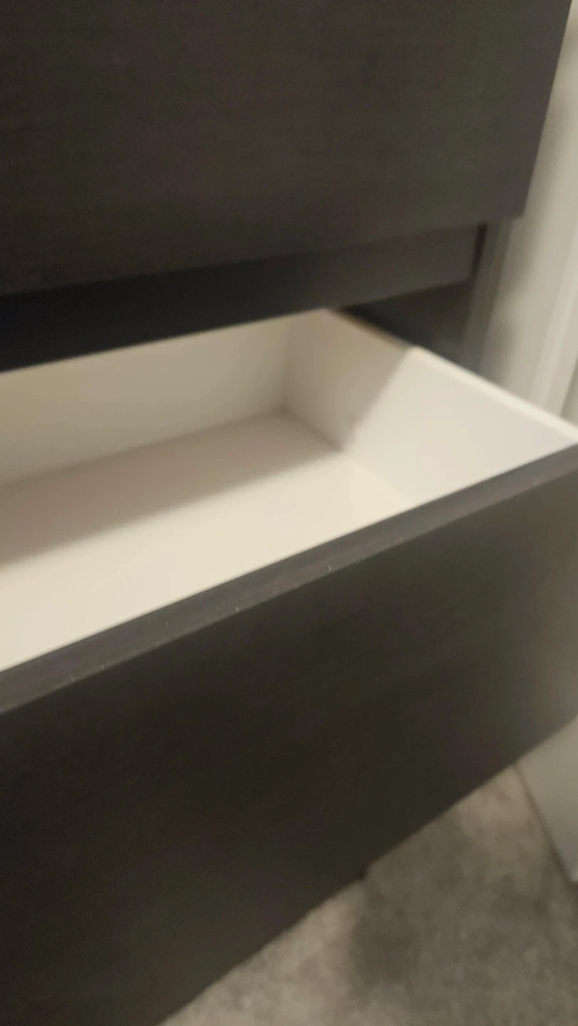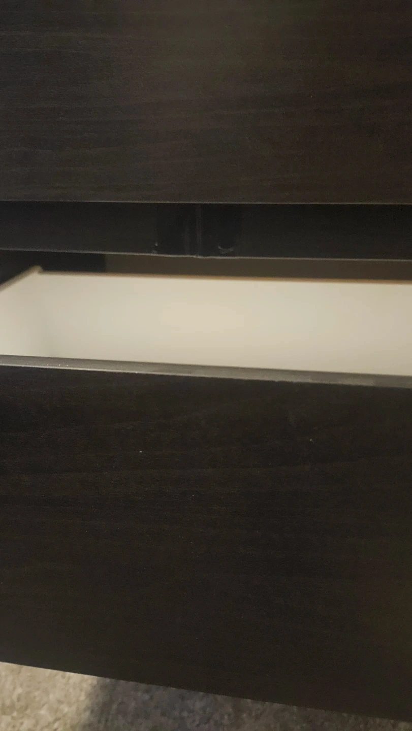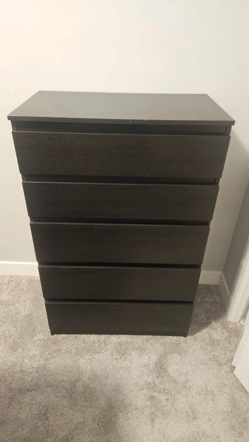 A dark wood dresser with five drawers. It's a great storage solution for any bedroom. The simple design fits most decor styles. Small repair done on one crossbar but it still functions fine.