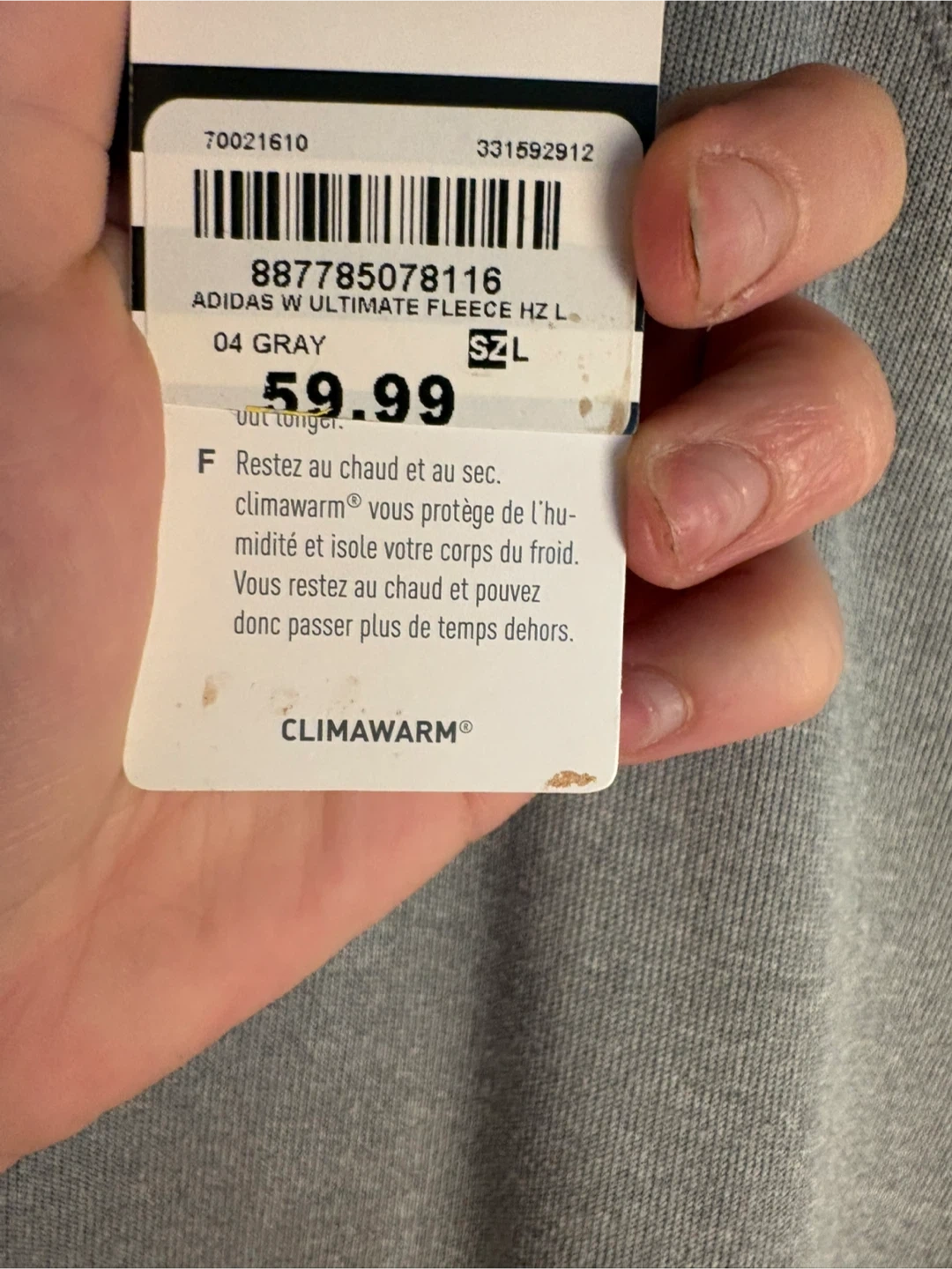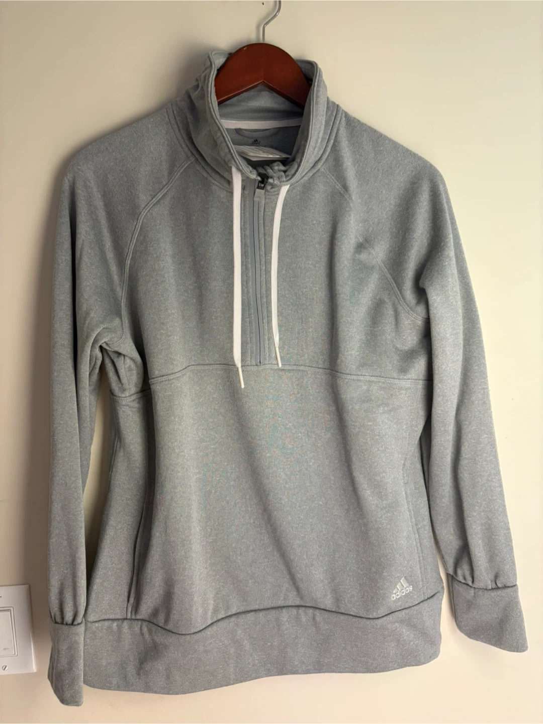 This is an Adidas Women's Ultimate Fleece pullover in grey. It features ClimaWarm technology for warmth. The size is large.