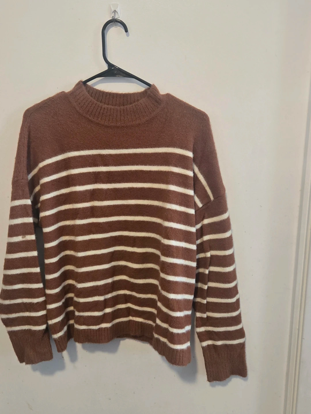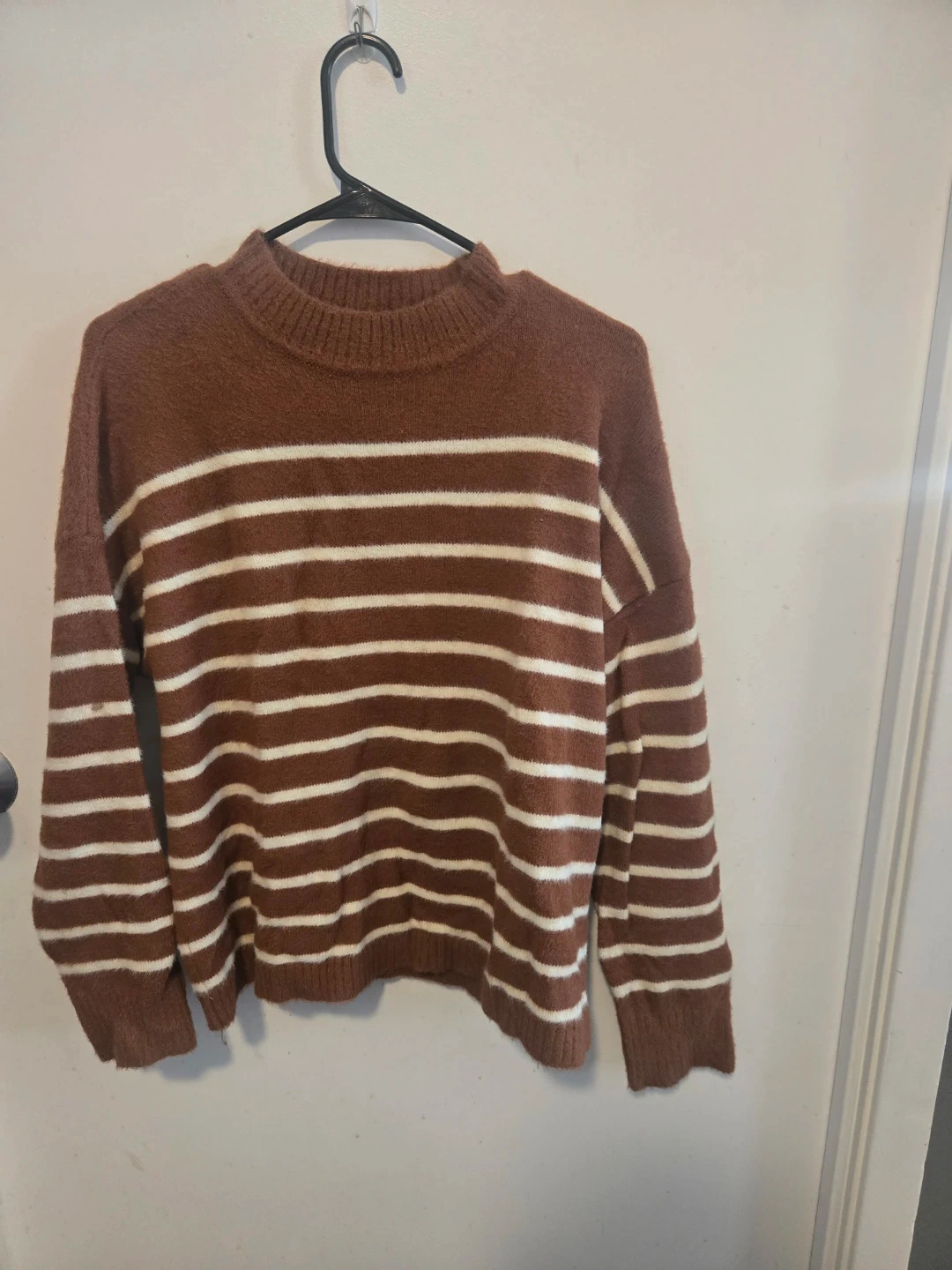 Selling this soft dark orange and cream striped sweater from Suzy Shier 🧑 Worn but good condition. Clean, no stains, pet free smoke free home. Cash only Always open to trade offers as well! 😊