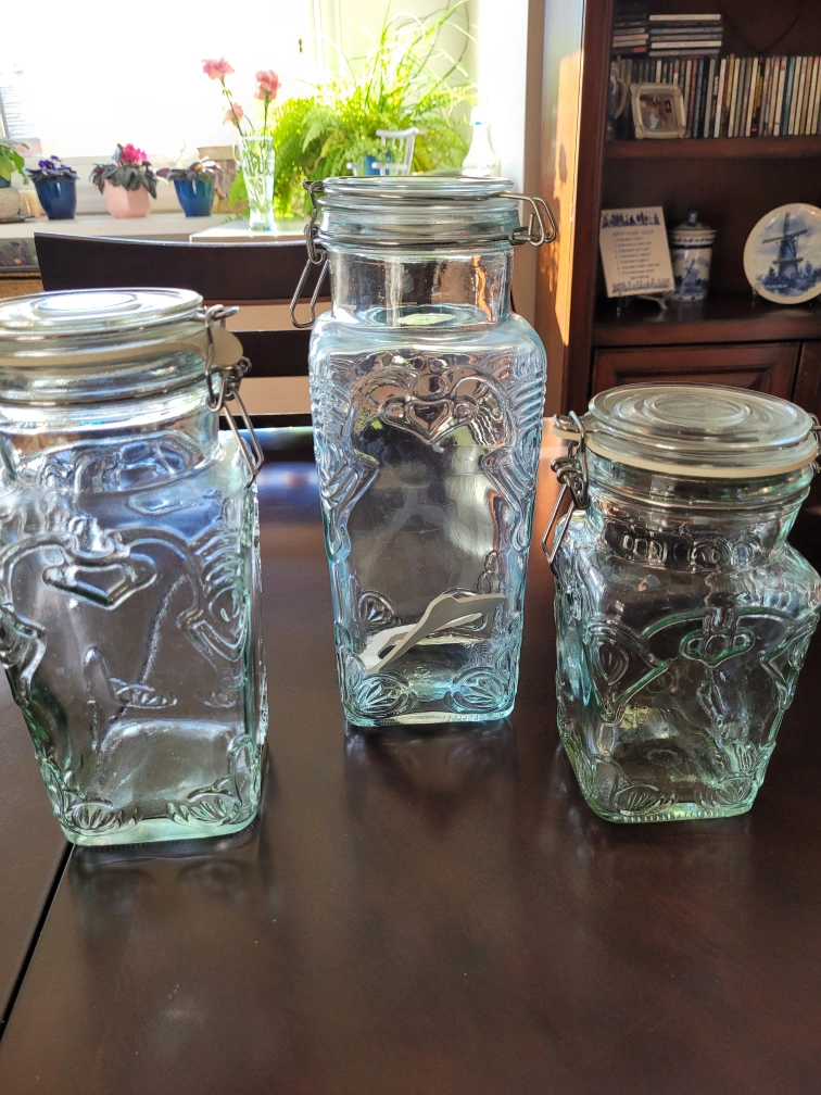Set of three glass jars with lids, all with an embossed design and a silver hinge. The jars are clear glass with a light green tint. Has all good seals to keep items fresh.