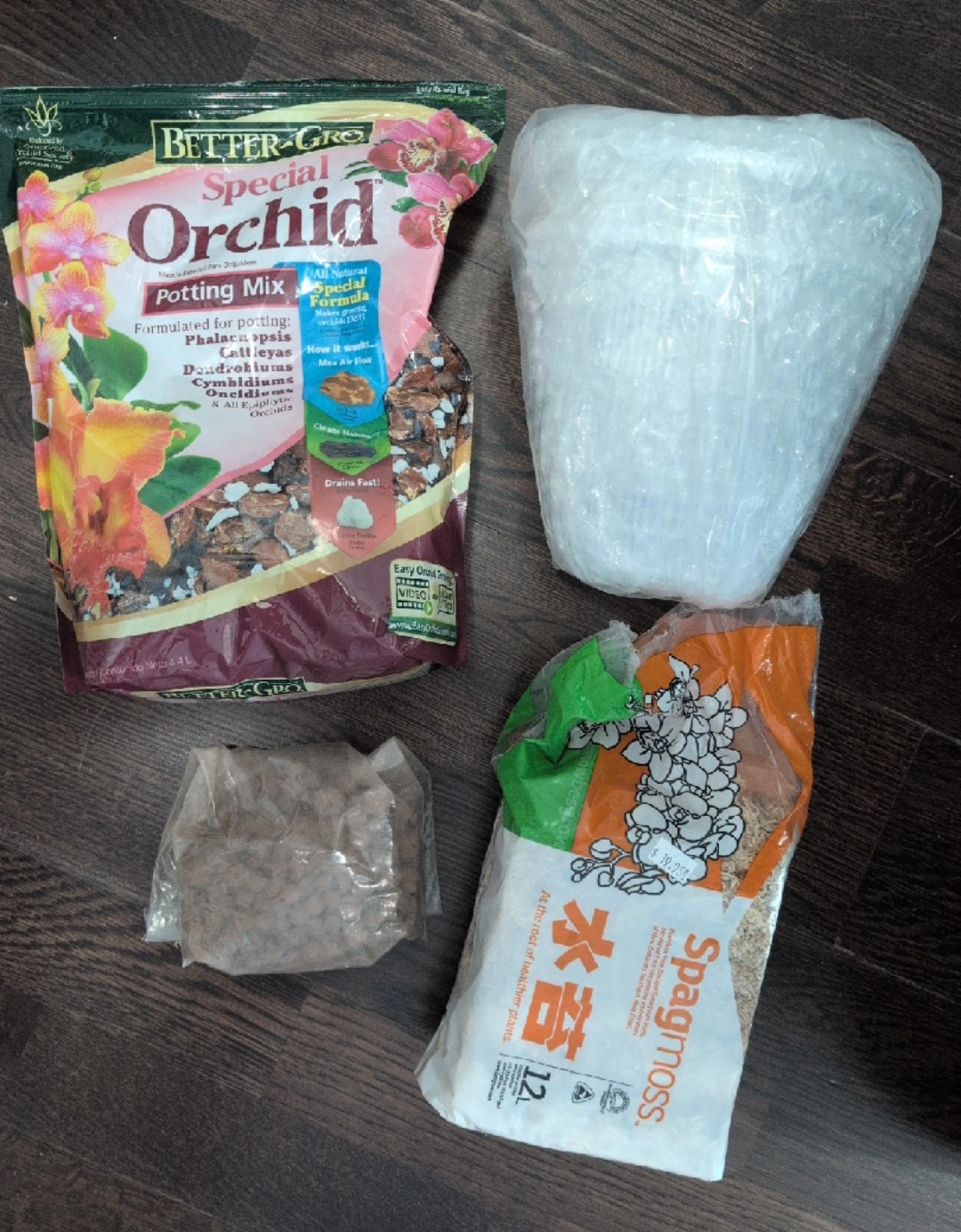 Also included are open packets of Better-Gro Special Orchid Potting Mix, sphagnum moss and leca balls for all your orchid needs