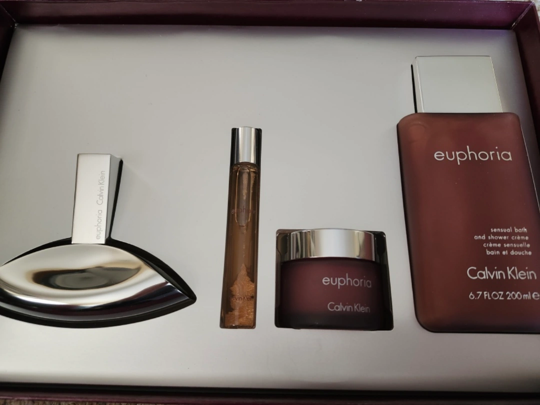 Calvin Klein Euphoria gift set. Includes perfum 50 ml , shower gel, body cream and rollerball. Sensual bath and shower creme. Was Reg. $120.00