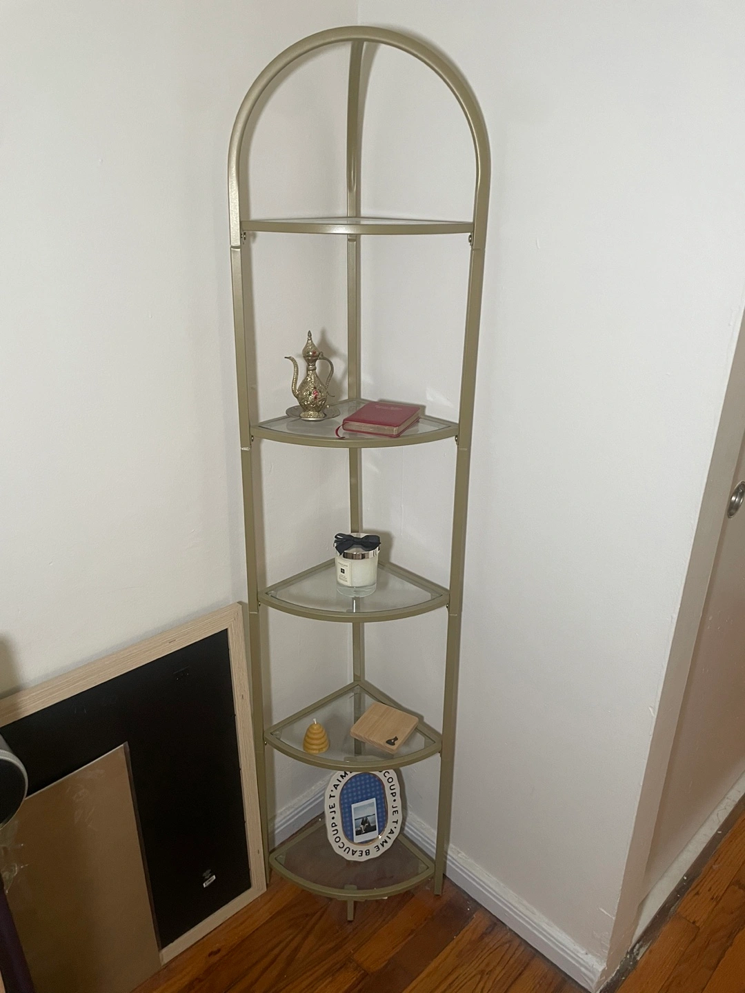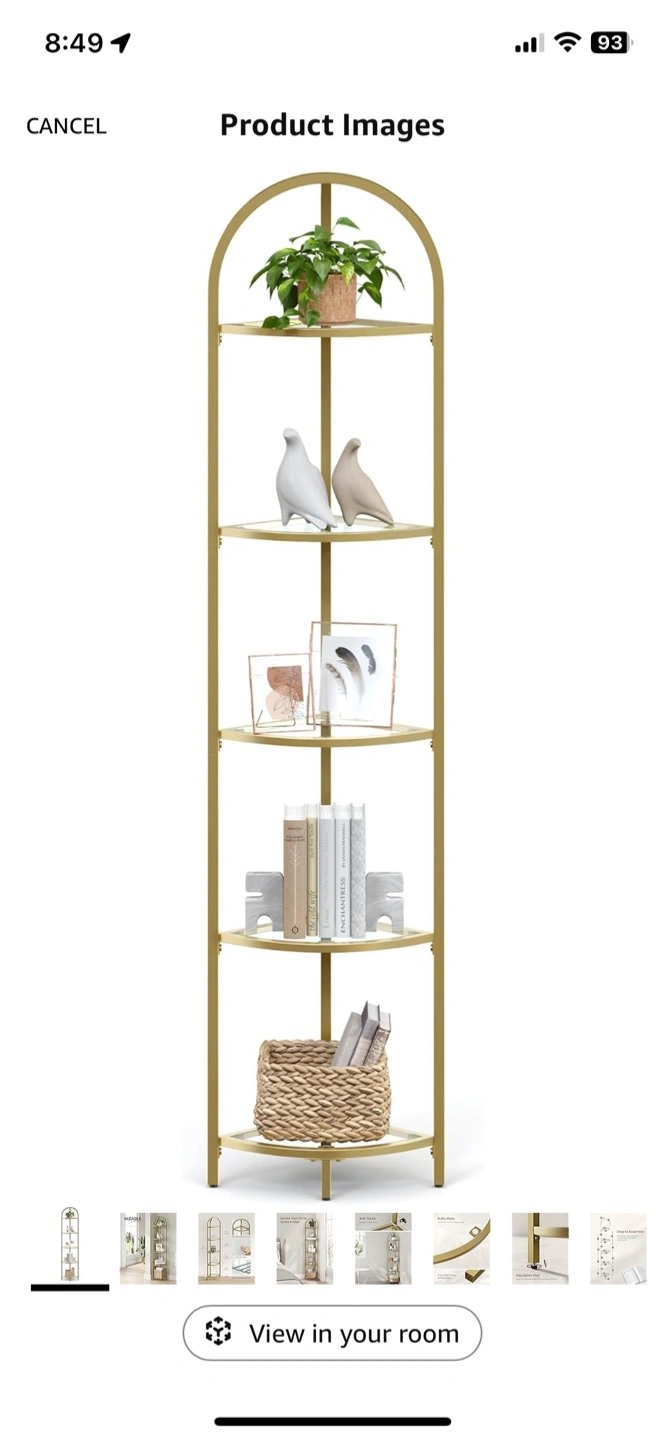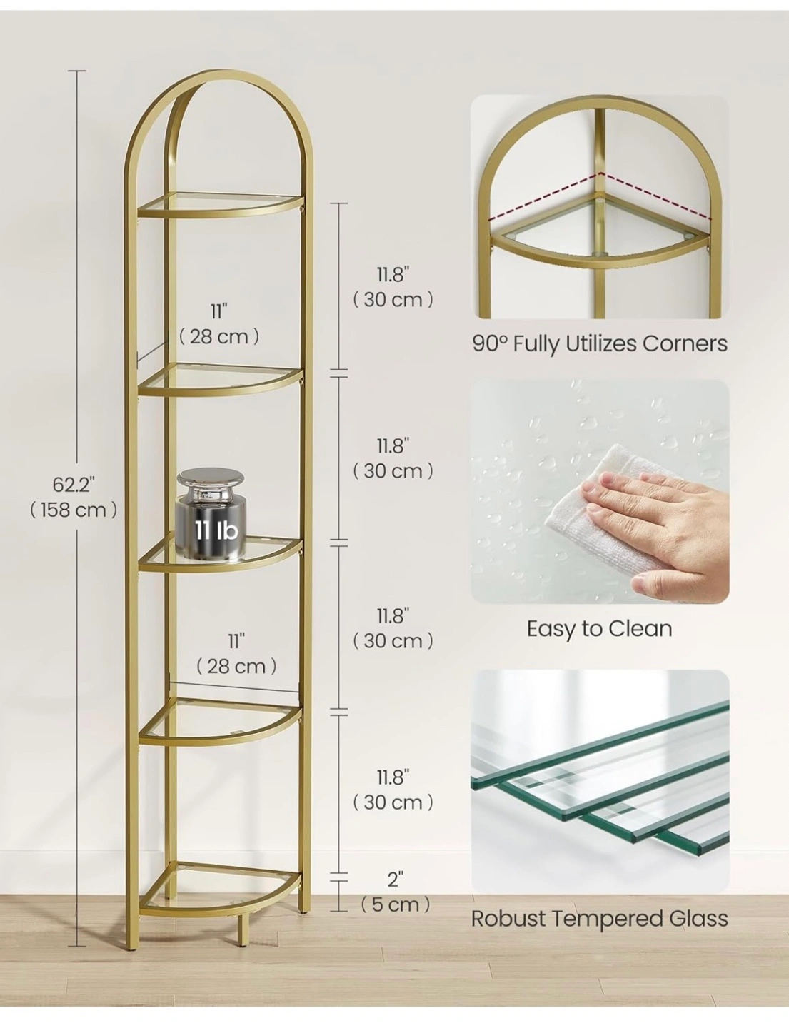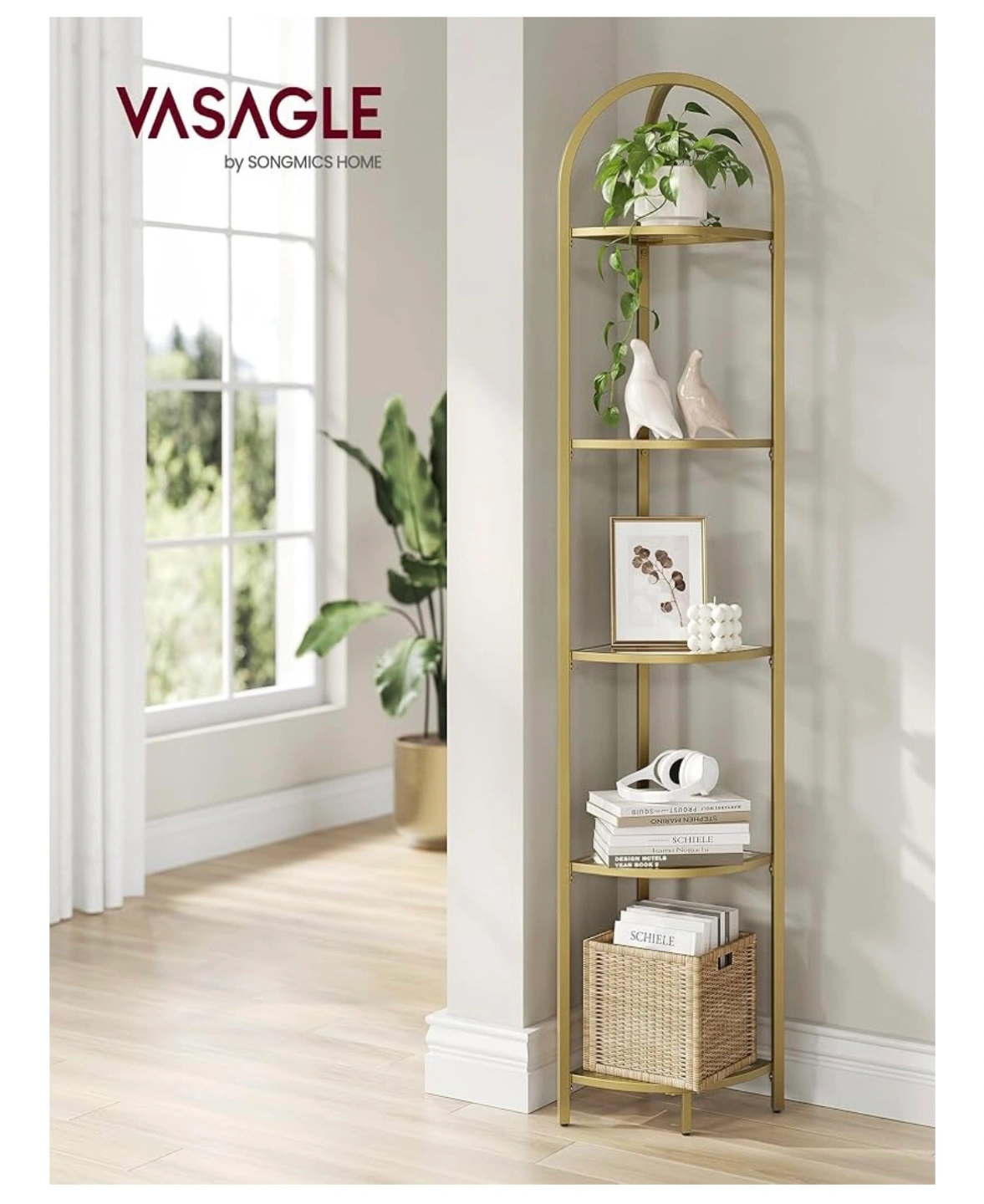 This VASAGLE corner shelf is perfect for utilizing corner spaces! It features 5 tiers of robust tempered glass shelves that are easy to clean. The gold frame adds a touch of elegance to any room.