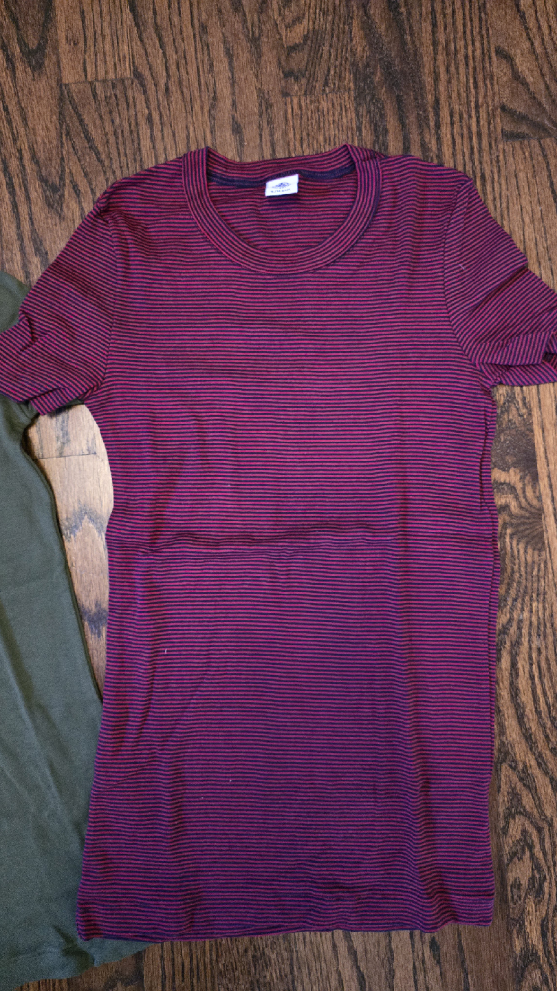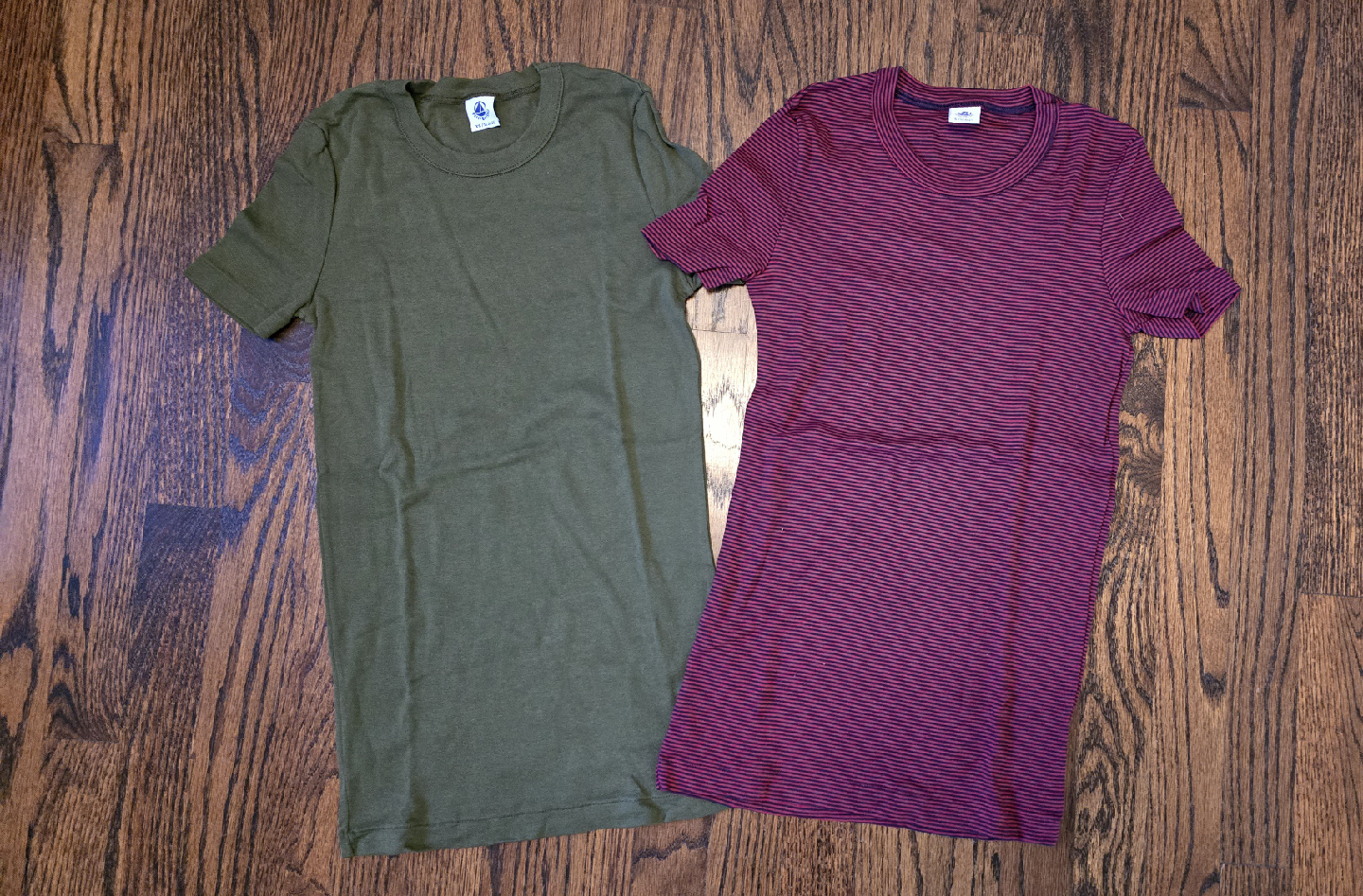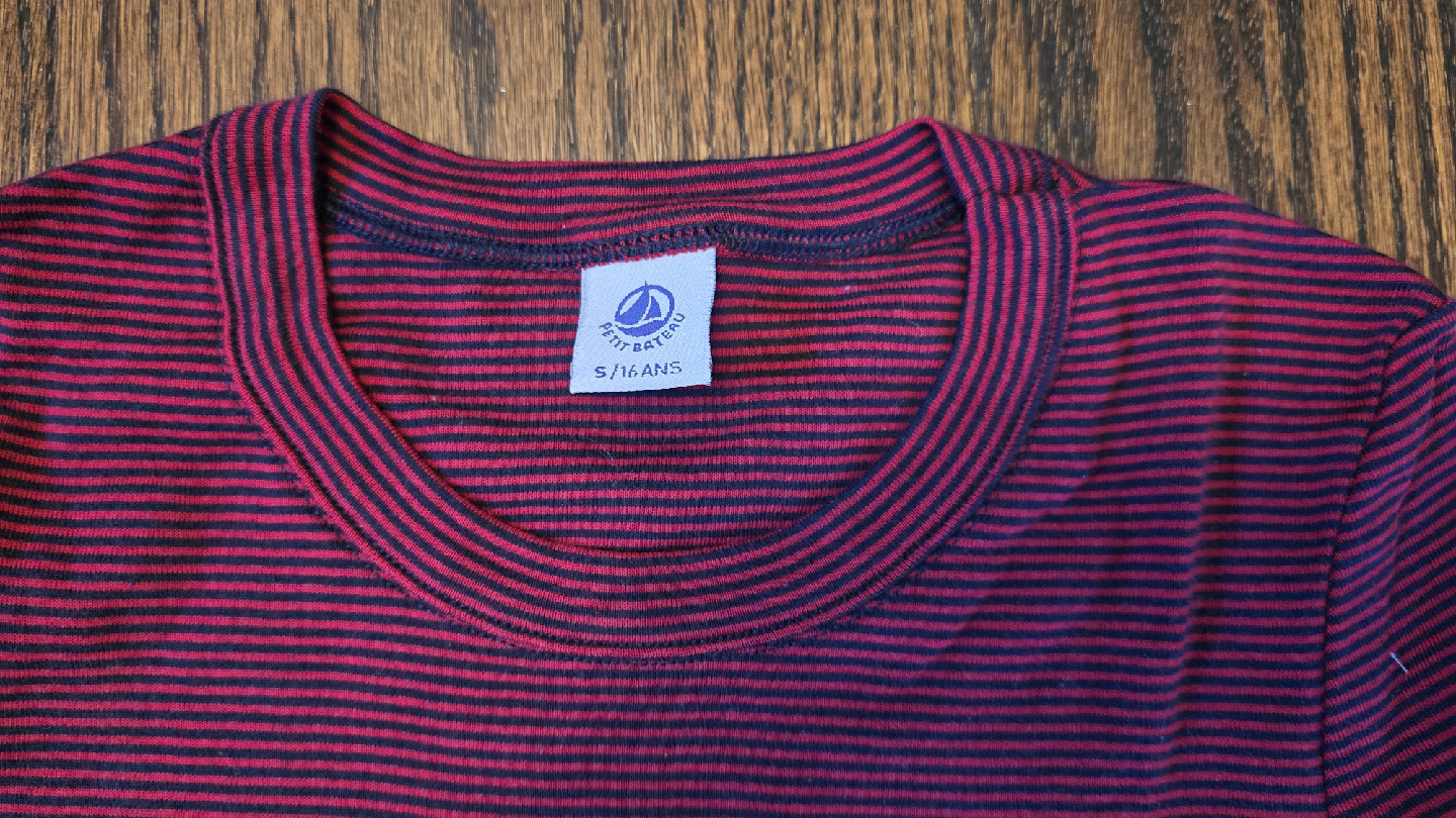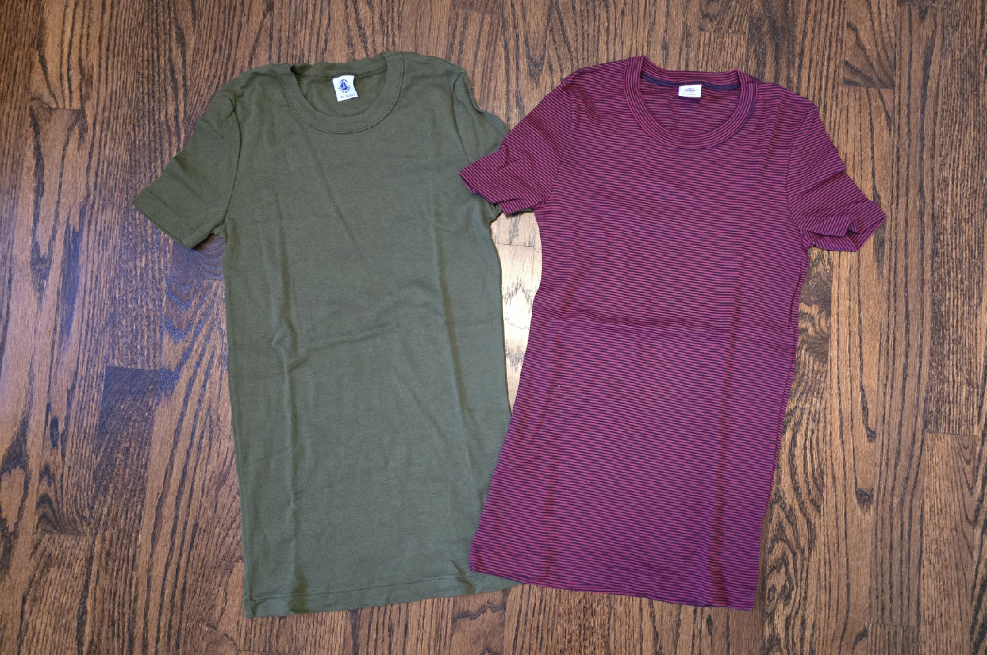 Petit Bateau 2 New T-shirts for sale! One is solid olive green, size XS (14 ans). The other is striped red and navy, size S (16 ans).