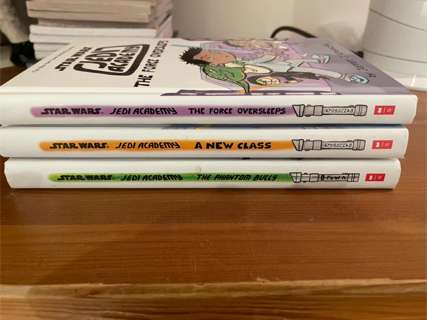 This set includes three Star Wars Jedi Academy books: The Force Oversleeps, A New Class, and The Phantom Bully. They are written and illustrated by Jarrett J. Krosoczka. These books are part of The New York Times bestselling series. Perfect for young Star Wars fans! $10 each $25 for the three of them