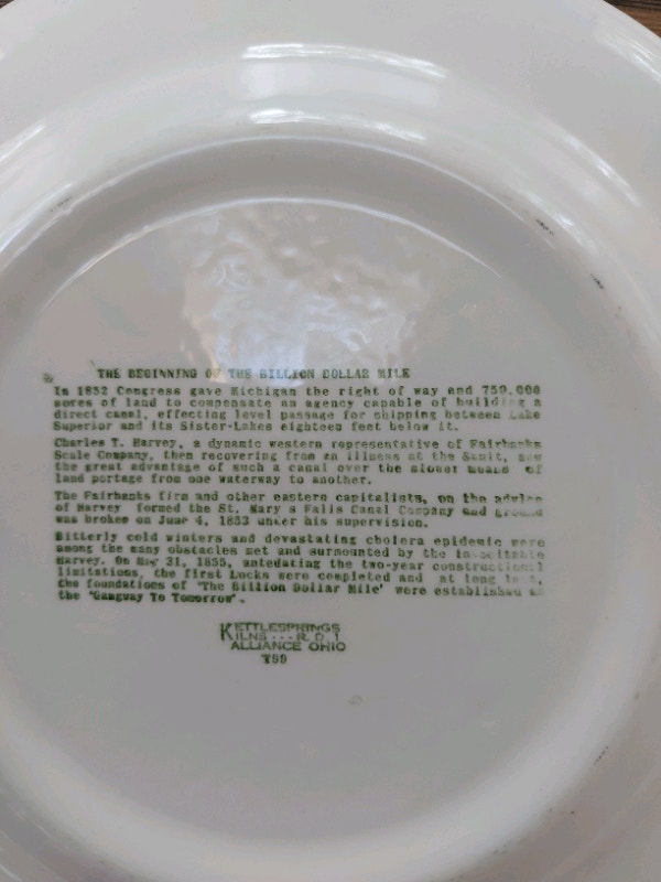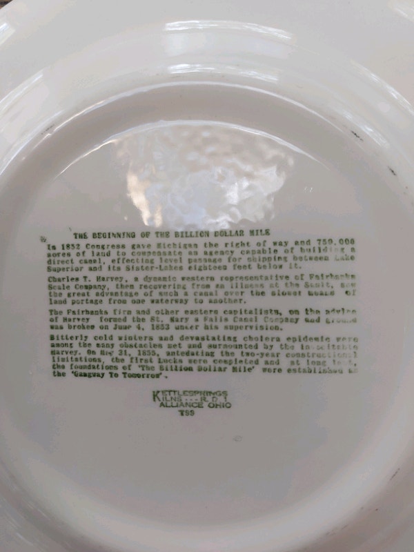 1855-1955 Original Soo Locks completed on May 31, 1855. The history of the "Billion Dollar Mile" is explained on the back of the plate. Commemorate this historic achievement.
