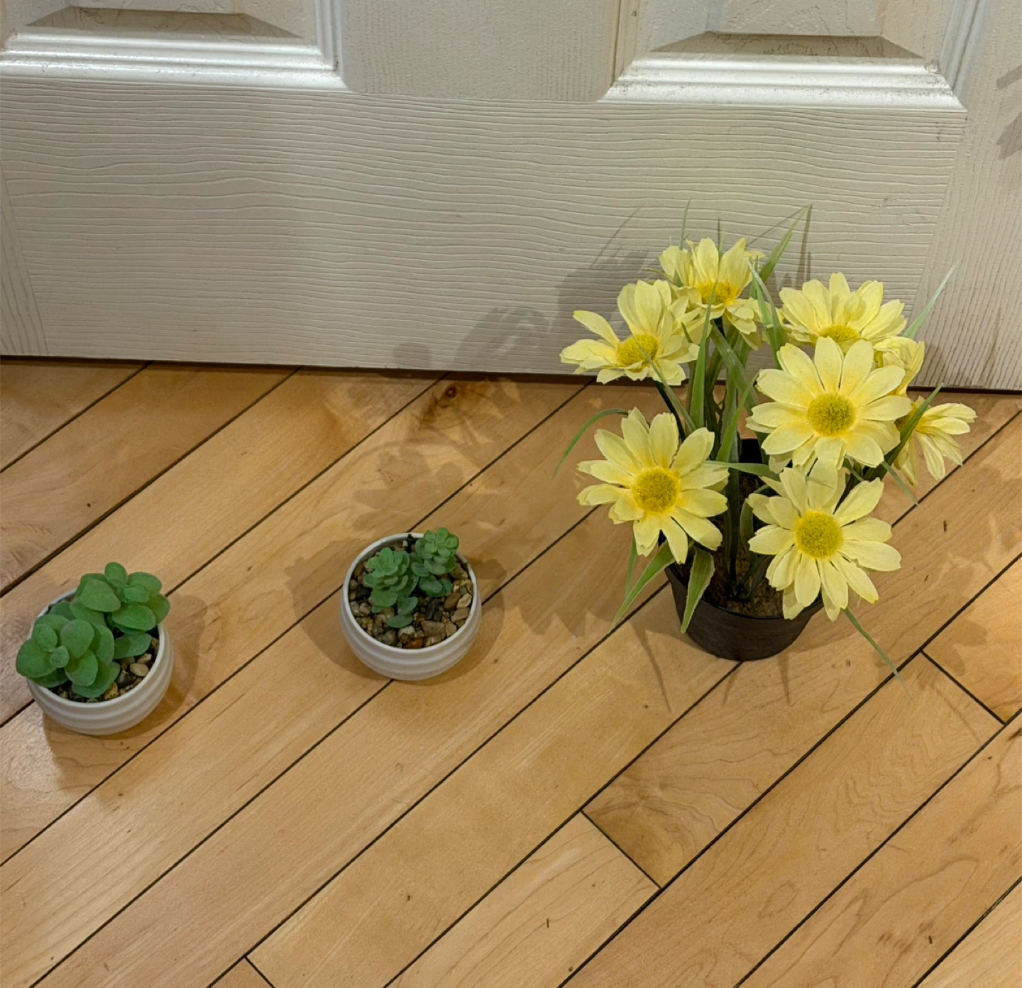 Three decorative pieces for your home. Two small succulents in white ribbed pots and one bunch of yellow artificial daisies in a dark pot. These require no watering!