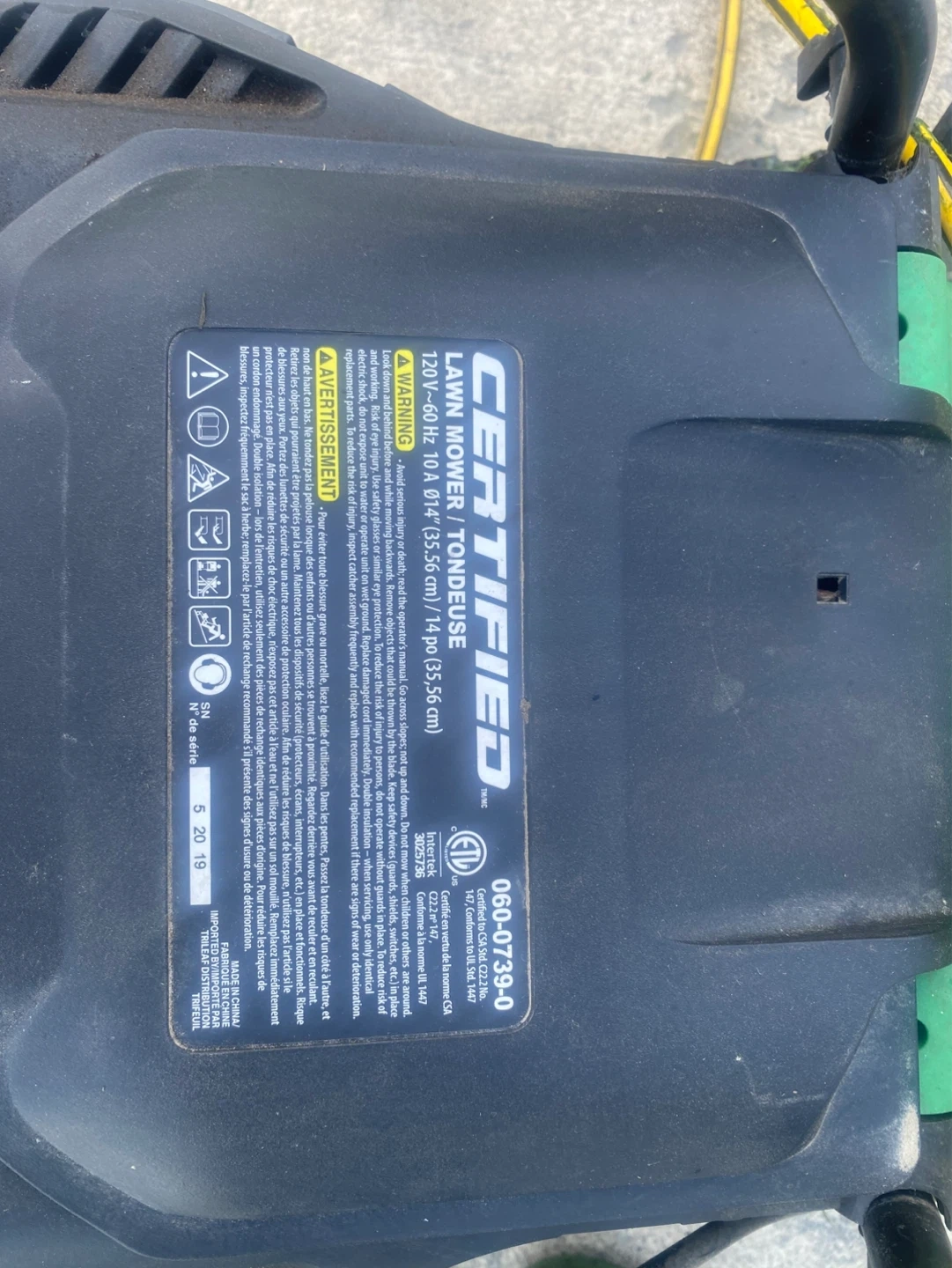 CERTIFIED 120V electric lawn mower with a 14-inch cutting deck. Includes power cord. It's ready for your lawn maintenance needs!