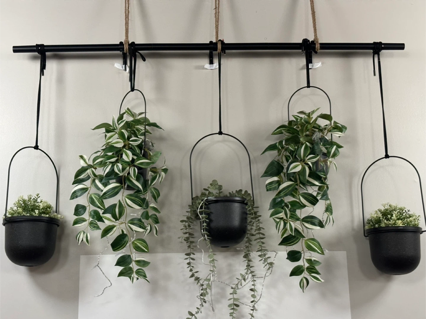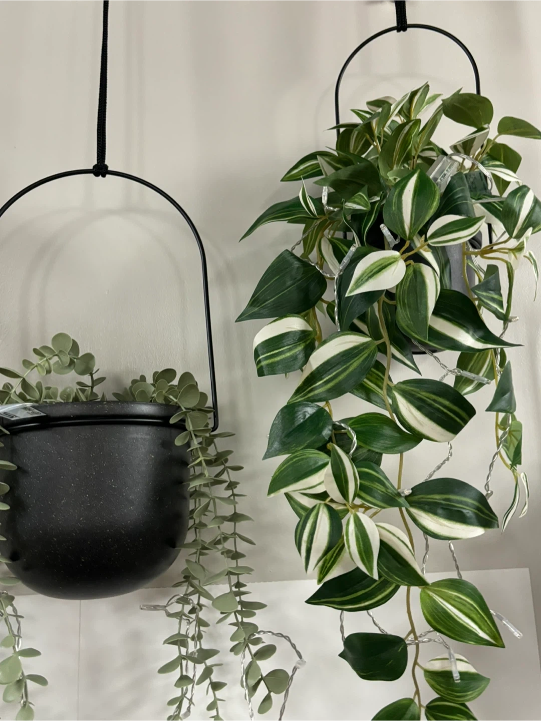 This Umbra hanging planter features a speckled black finish and comes with a faux plant. It's ideal for adding a touch of greenery to any space without the need for watering! The planter has a modern design and includes a plant with variegated leaves.