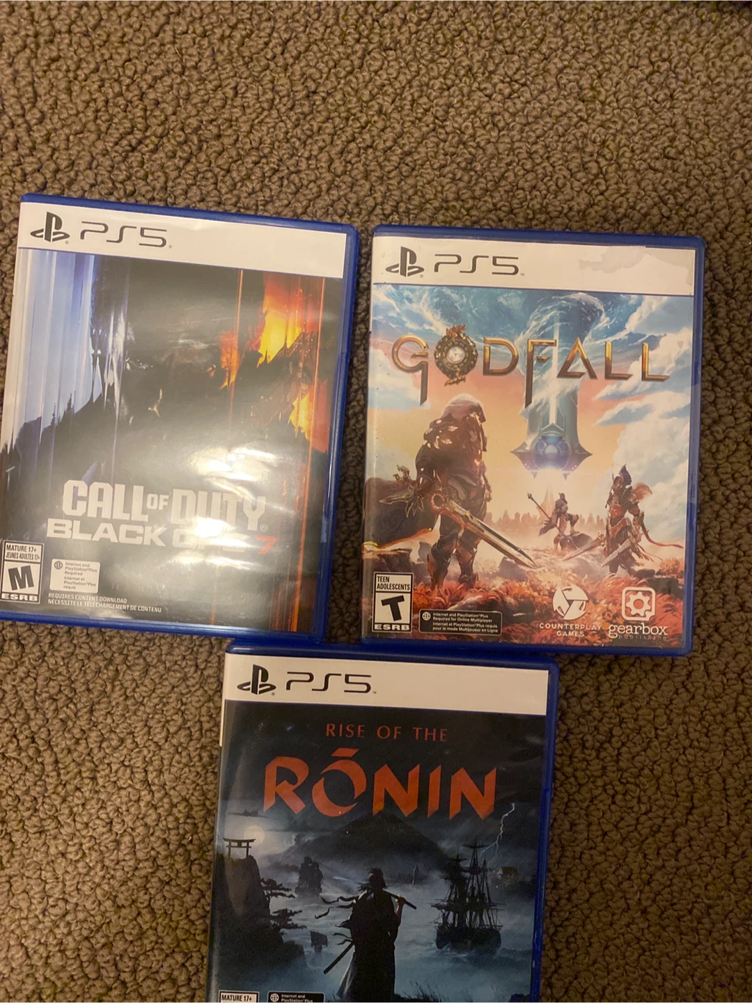 Three PlayStation 5 video games are available. Titles include Call of Duty: Black Ops, Godfall, and Rise of the Ronin. These are PS5 disc versions.
