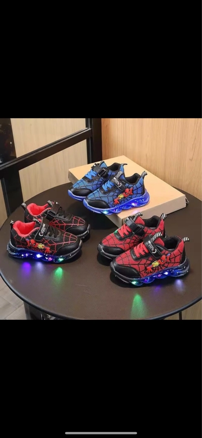 Cute children's shoes. Feature Spider-Man design. Light-up soles. Velcro closure. Available in red , black and blue. Perfect for indoor and outdoor