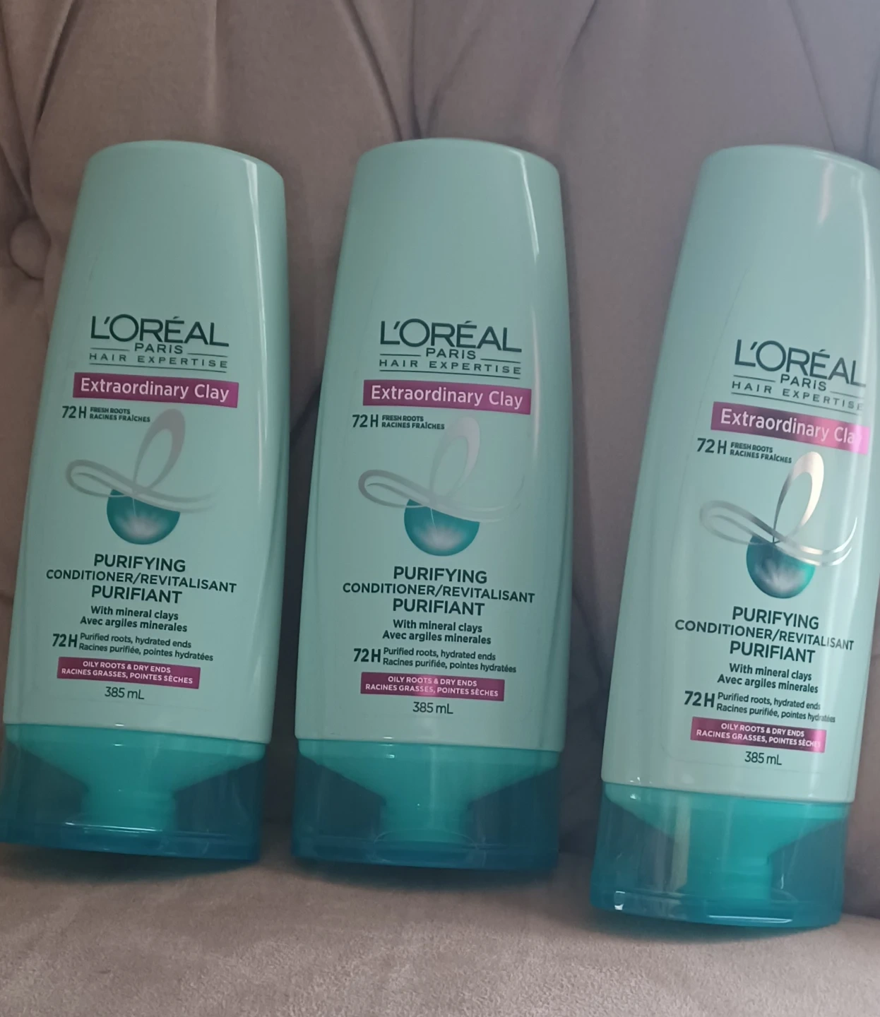This L'Oréal Paris Extraordinary Clay Purifying Conditioner is designed for oily roots and dry ends. It purifies the scalp and hydrates lengths for 72 hours. The formula with mineral clays leaves hair healthy, fresh, and light. 385 mL bottles.