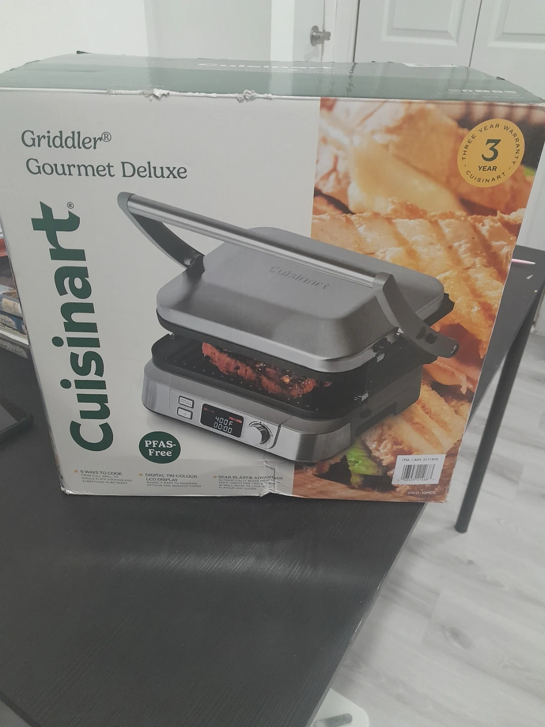 This Cuisinart Griddler Gourmet Deluxe is a versatile kitchen appliance. It offers 6 ways to cook, from single plate cooking to full griddle use. Features a digital tri-colour LCD display and SearBlast Advantage. It's PFAS-free and comes with a 3-year warranty.