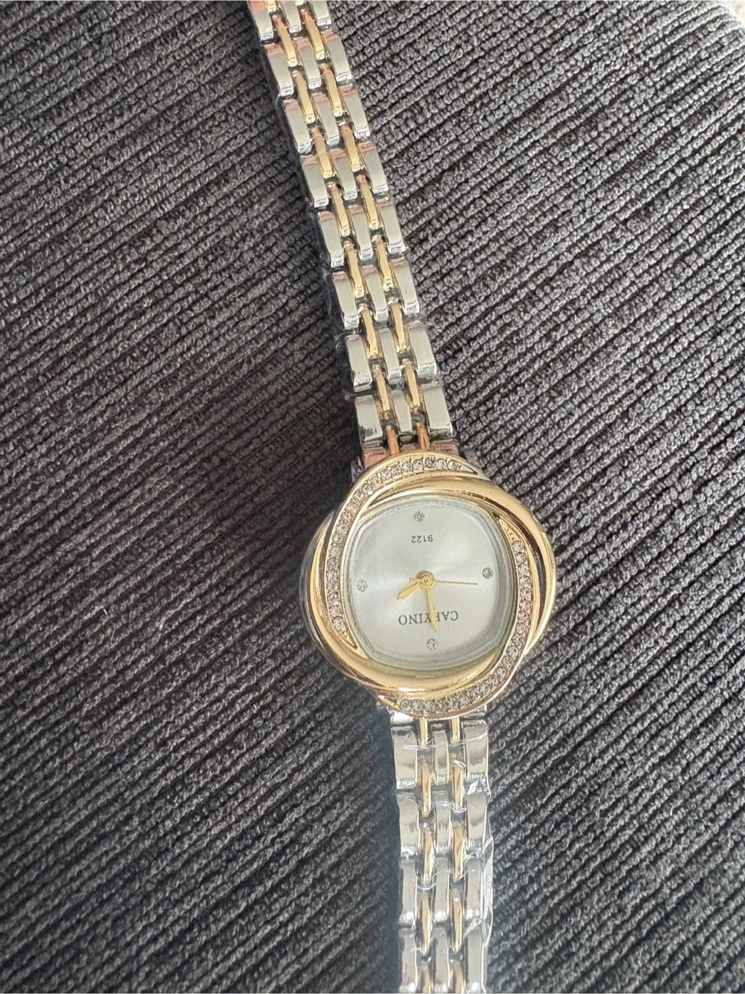 A Caryino women's watch with a two-tone metal band. It features a crystal-accented bezel and a silver-toned face with gold-toned hands and markers. This watch combines classic style with a bit of sparkle!
