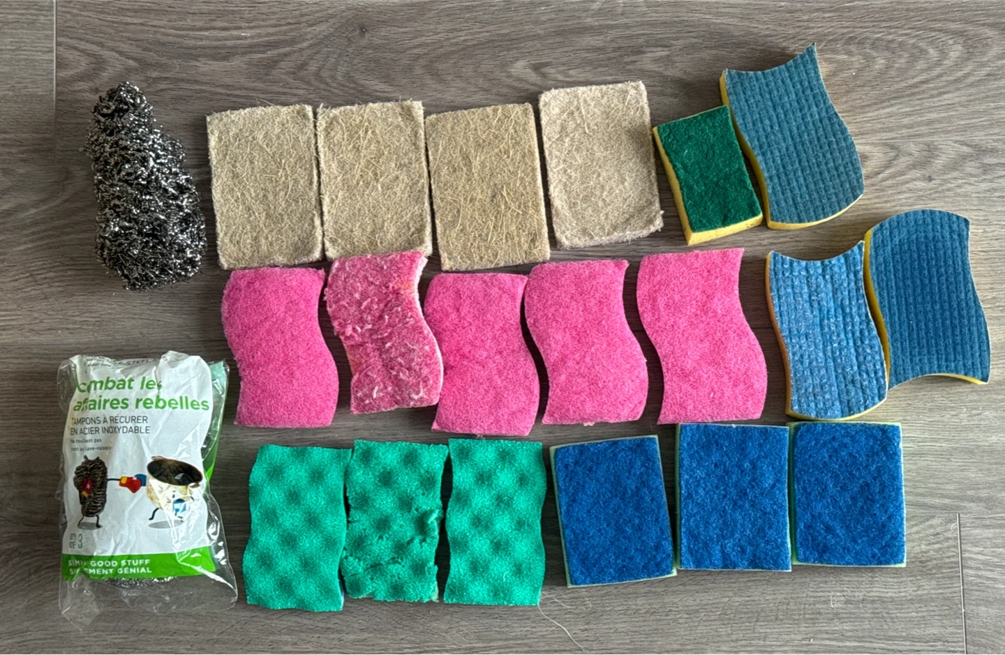 Selling a variety pack of scrubbing pads and steel wool. Includes stainless steel scrubbers, natural fiber pads, pink scrubbing pads, green scrubbing pads, and blue scrubbing pads. Great for all your cleaning needs!