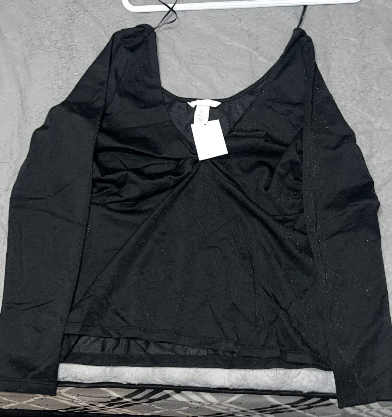 This H&M top has a sparkly black finish with long sleeves. It features a V-neckline and a flattering twisted front detail. The material appears to be a blend, offering a comfortable and stylish fit.
