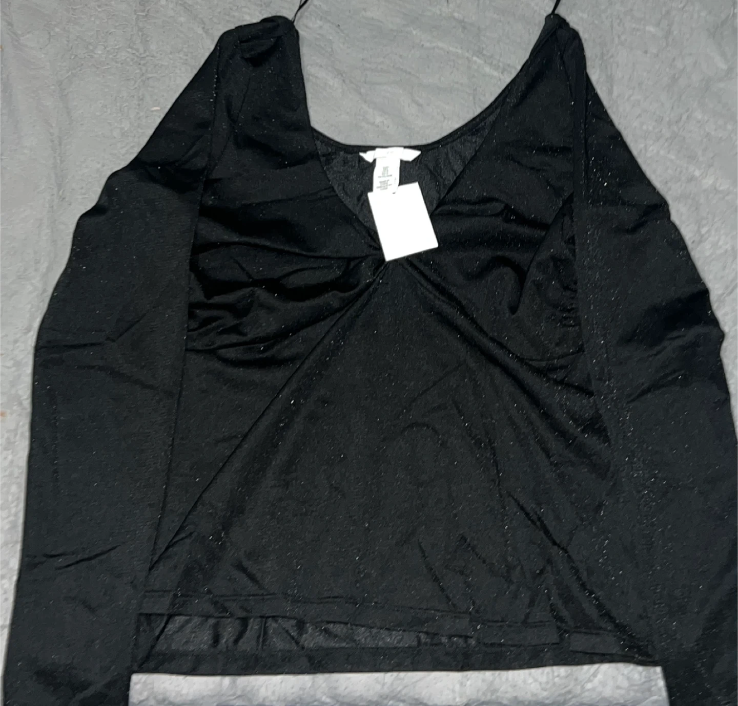 This H&M top has a sparkly black finish with long sleeves. It features a V-neckline and a flattering twisted front detail. The material appears to be a blend, offering a comfortable and stylish fit.