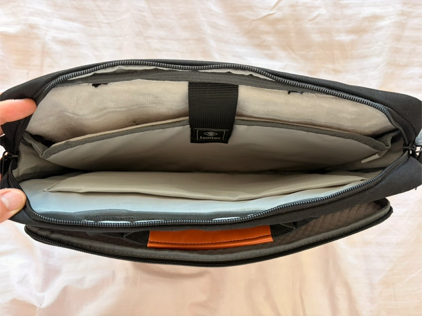 Selling a used tomtoc laptop bag. Plenty of pockets for organization and is in great condition. Please note that shoulder strap is missing.
