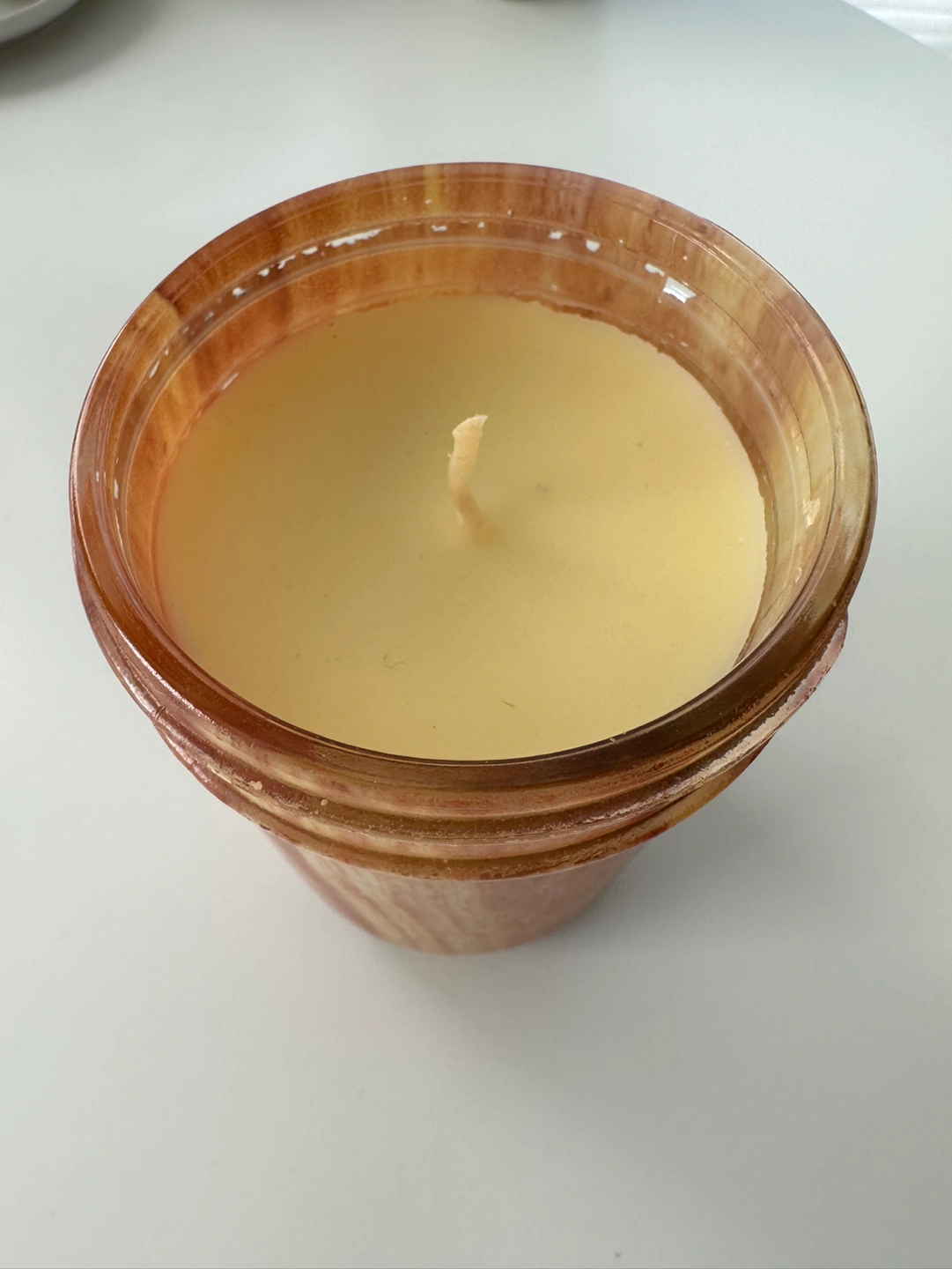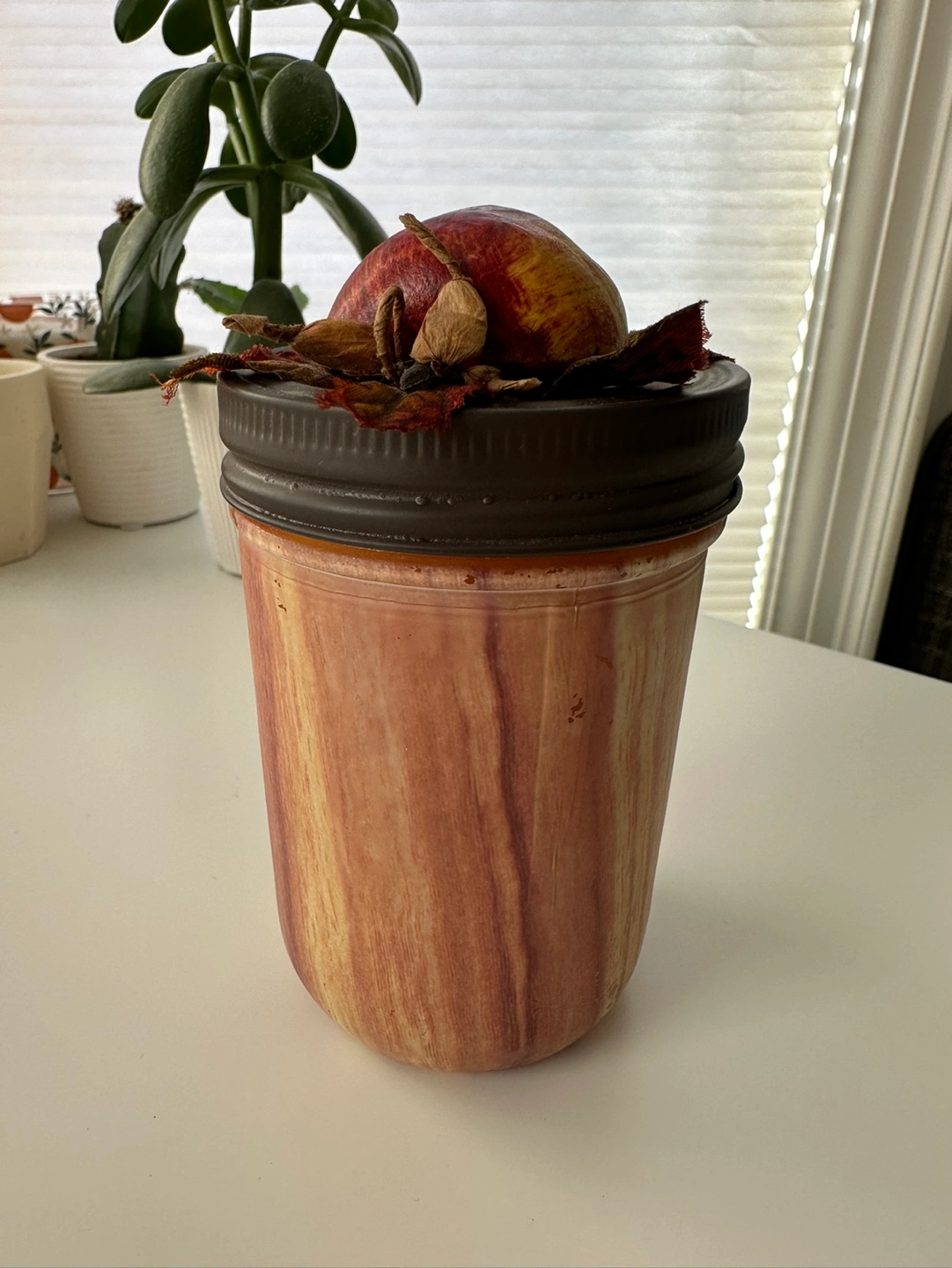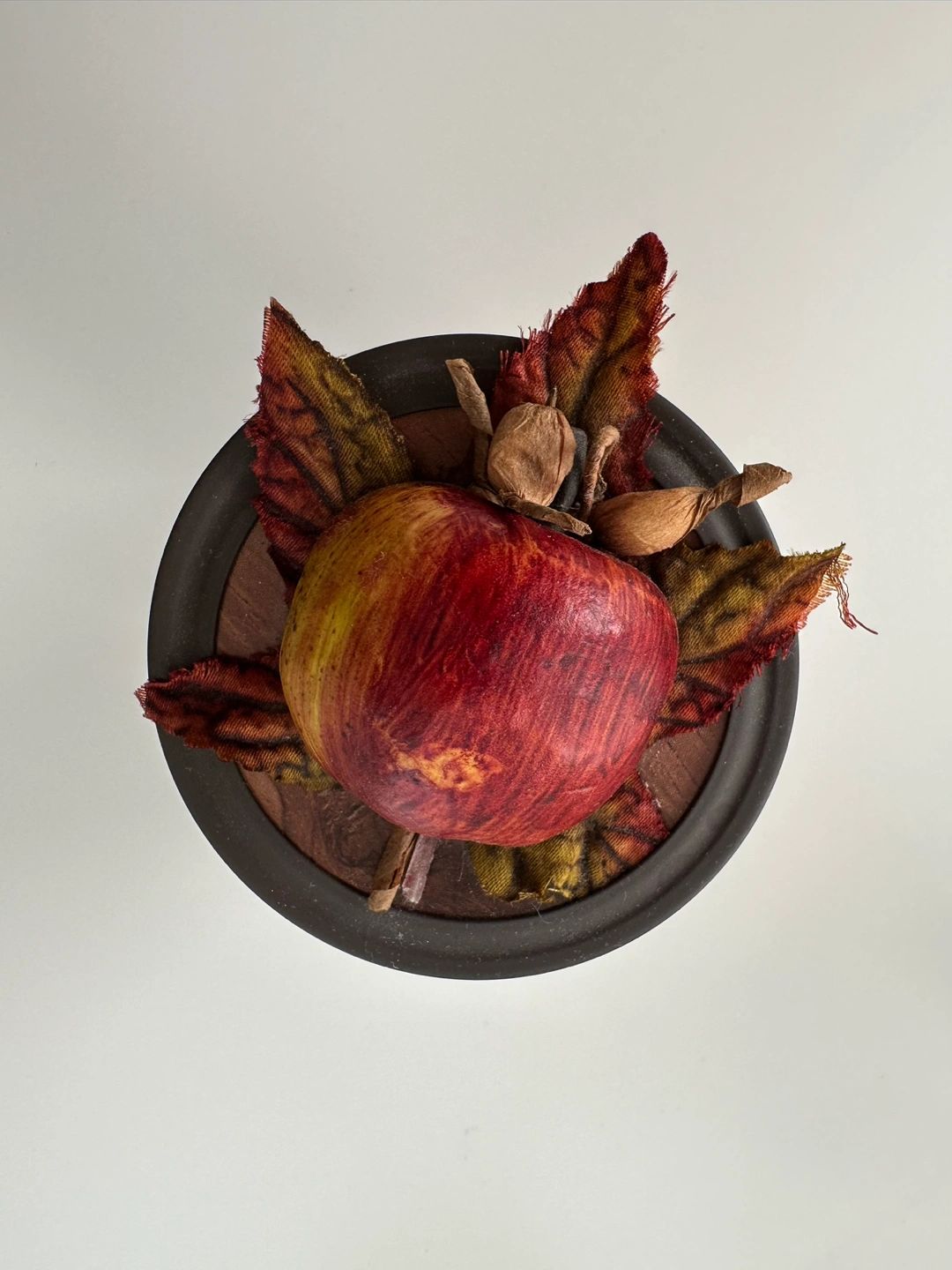 Get your cozy fall vibes going with this rustic looking candle, decorated with an autumn leaf and apple on the lid.