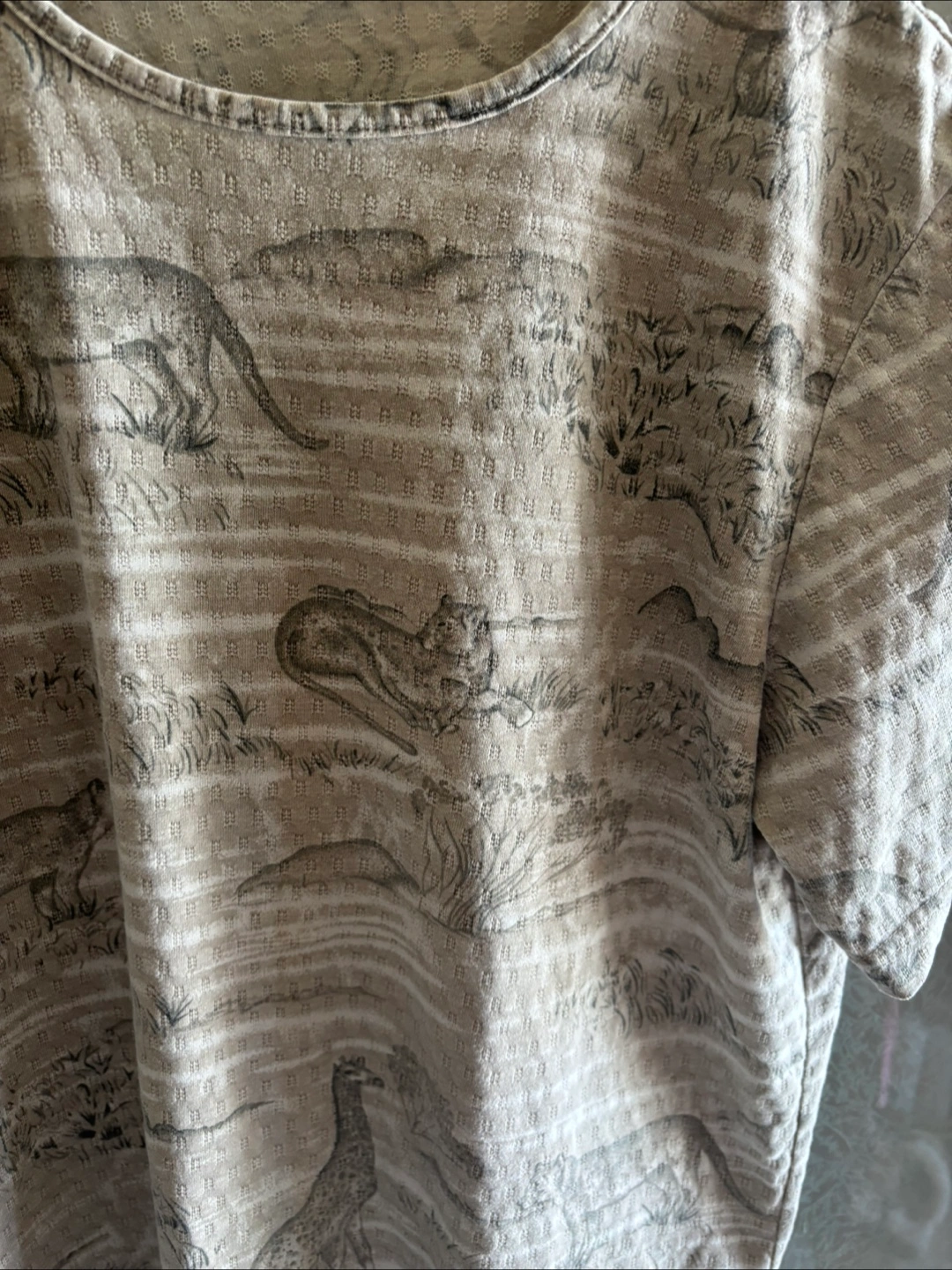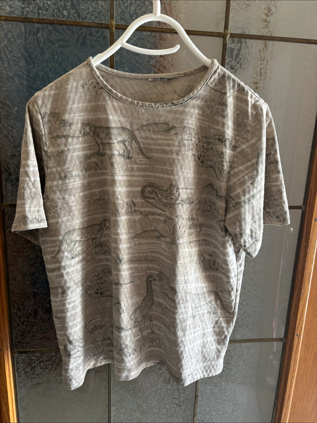 Short sleeve, crew neck, beige coloured t-shirt. Features a repeating pattern of various animals, including cougars, crocodiles and giraffes. 20” pit to pit. Cross posted.