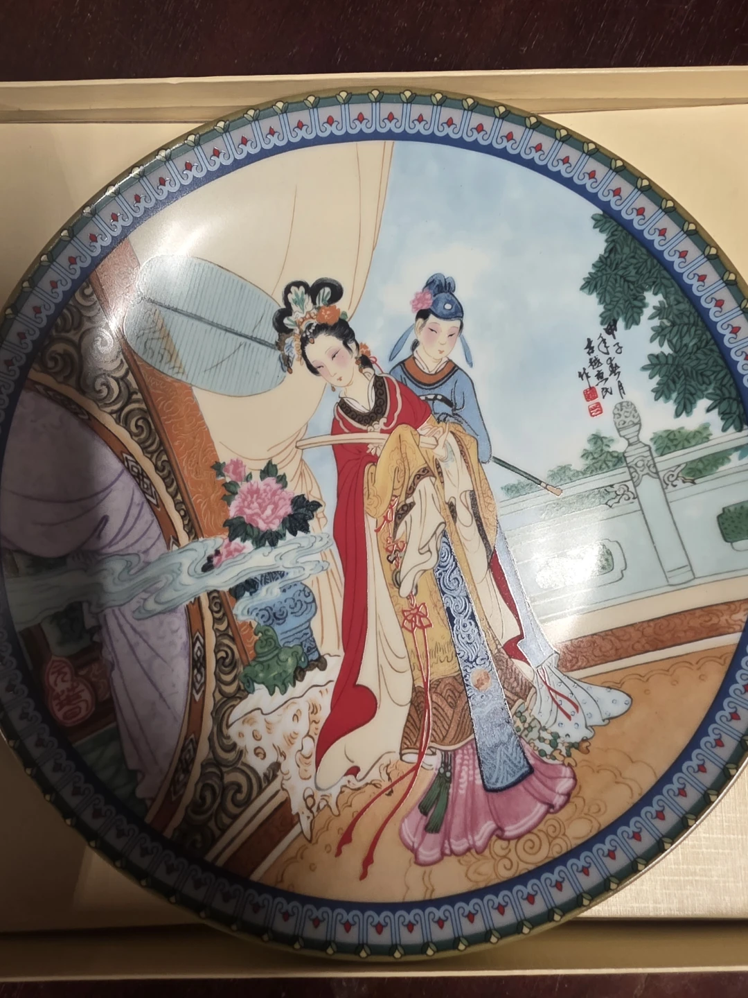 This is a decorative plate featuring traditional Chinese artwork. It depicts a scene with figures in historical attire, rendered in vibrant colours. The plate has a decorative border along the rim.