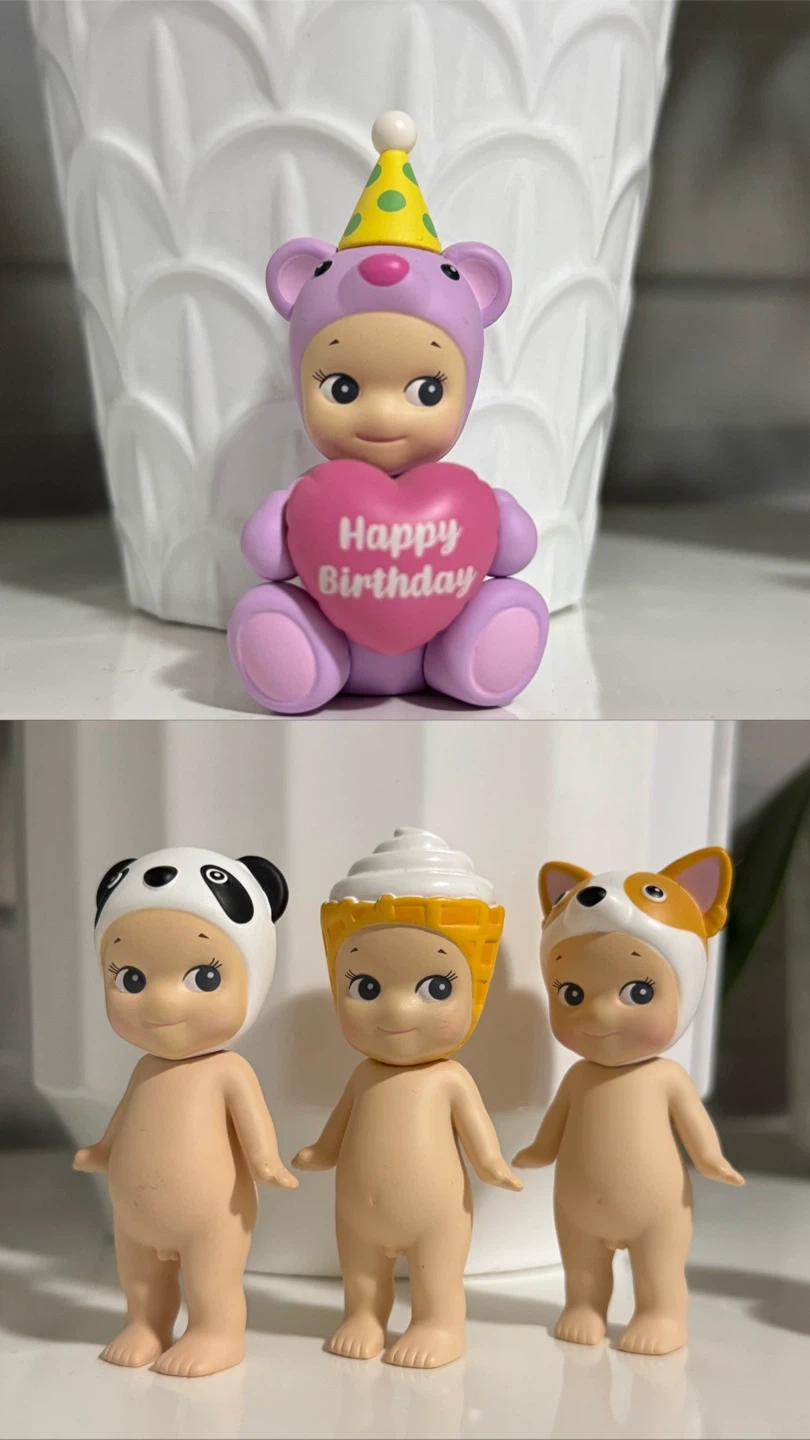 This listing includes a Sonny Angel figure dressed as a bear holding a pink 'Happy Birthday' heart. Also included are three other Sonny Angel figures: a panda, an ice cream cone, and a corgi. These are collectible figures.