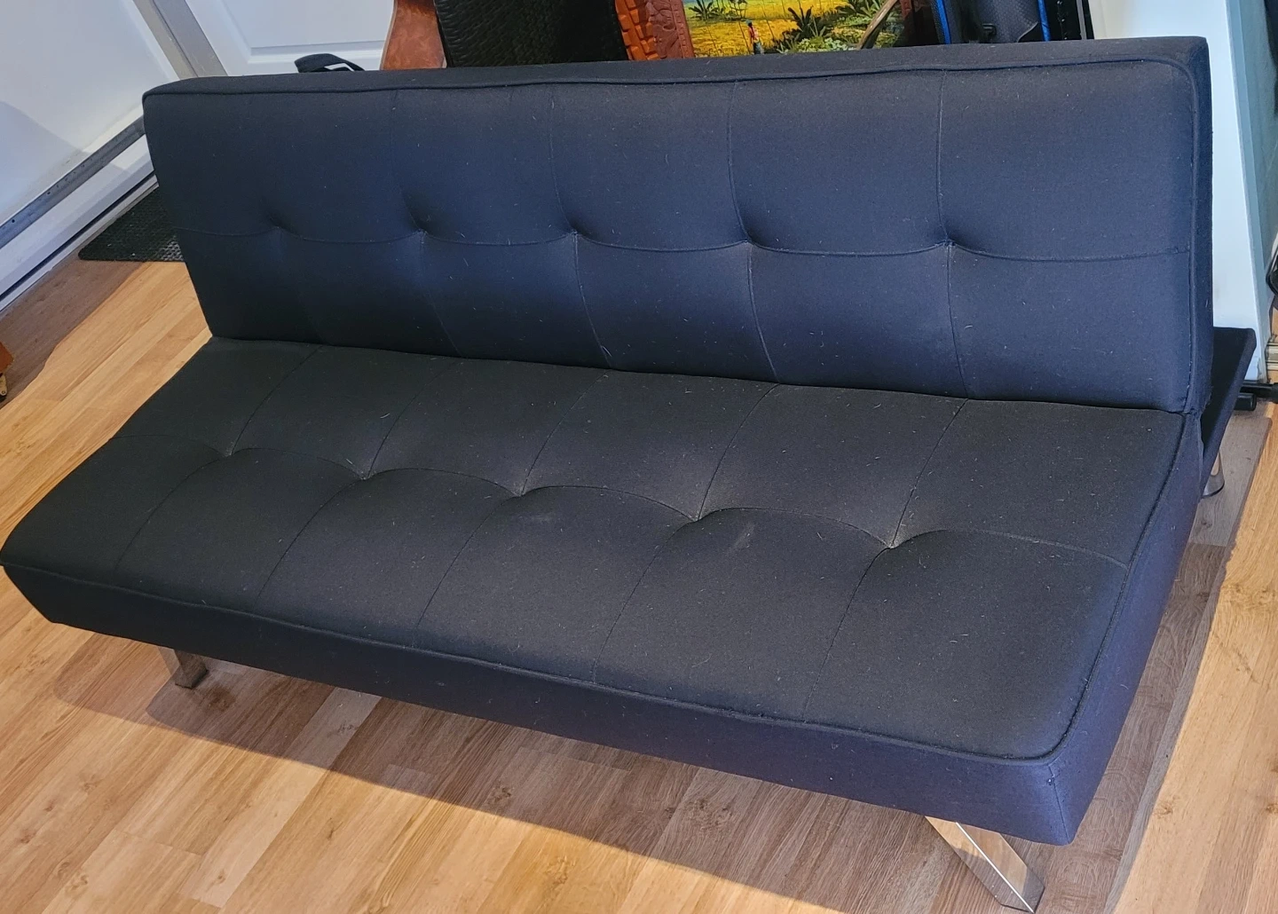 Sleek modern black sofa/couch, chrome legs, converts to bed. New this Rane sofa bed is $582 @Serta or Walmart.
