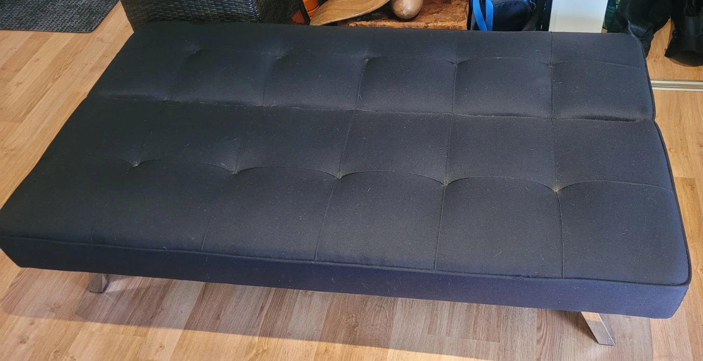 Sleek modern black sofa/couch, chrome legs, converts to bed. New this Rane sofa bed is $582 @Serta or Walmart.