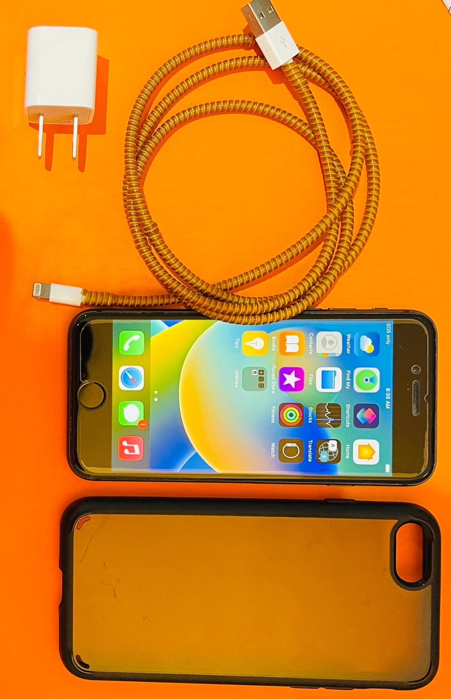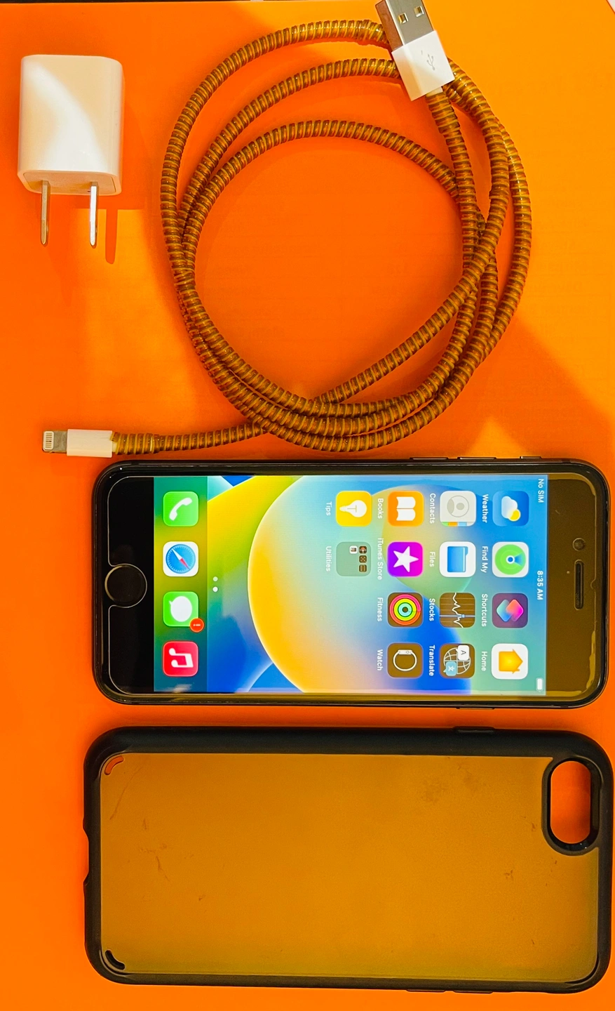 Black iPhone 8 with charger, cable, case and screen protector on.