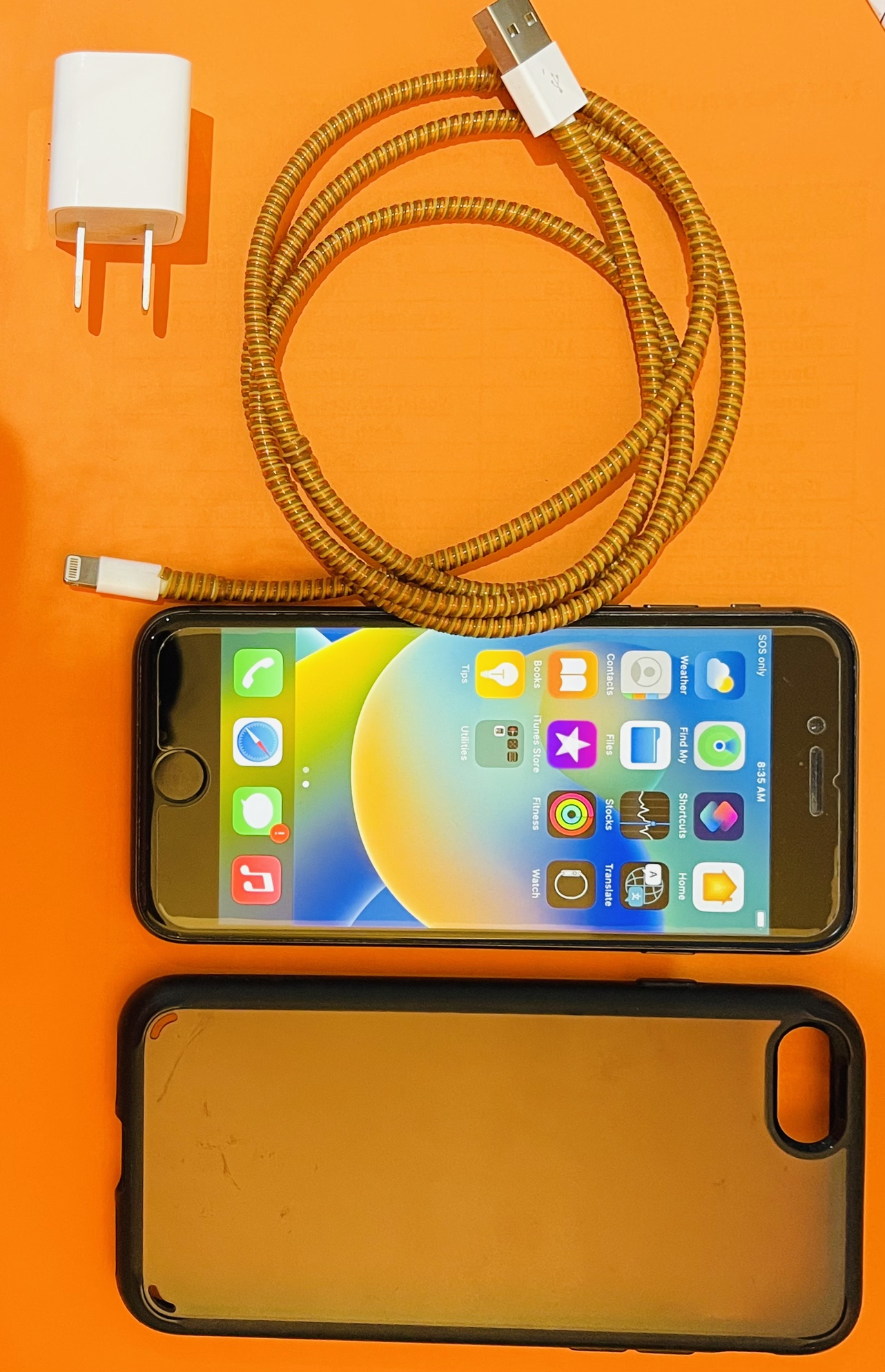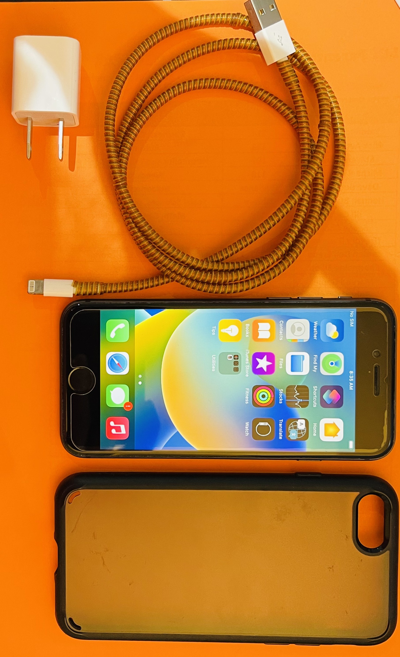Black iPhone 8 with charger, cable, case and screen protector on.