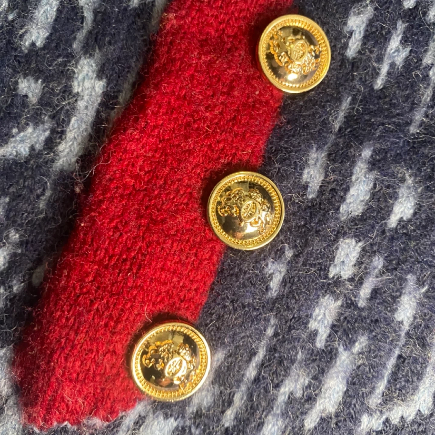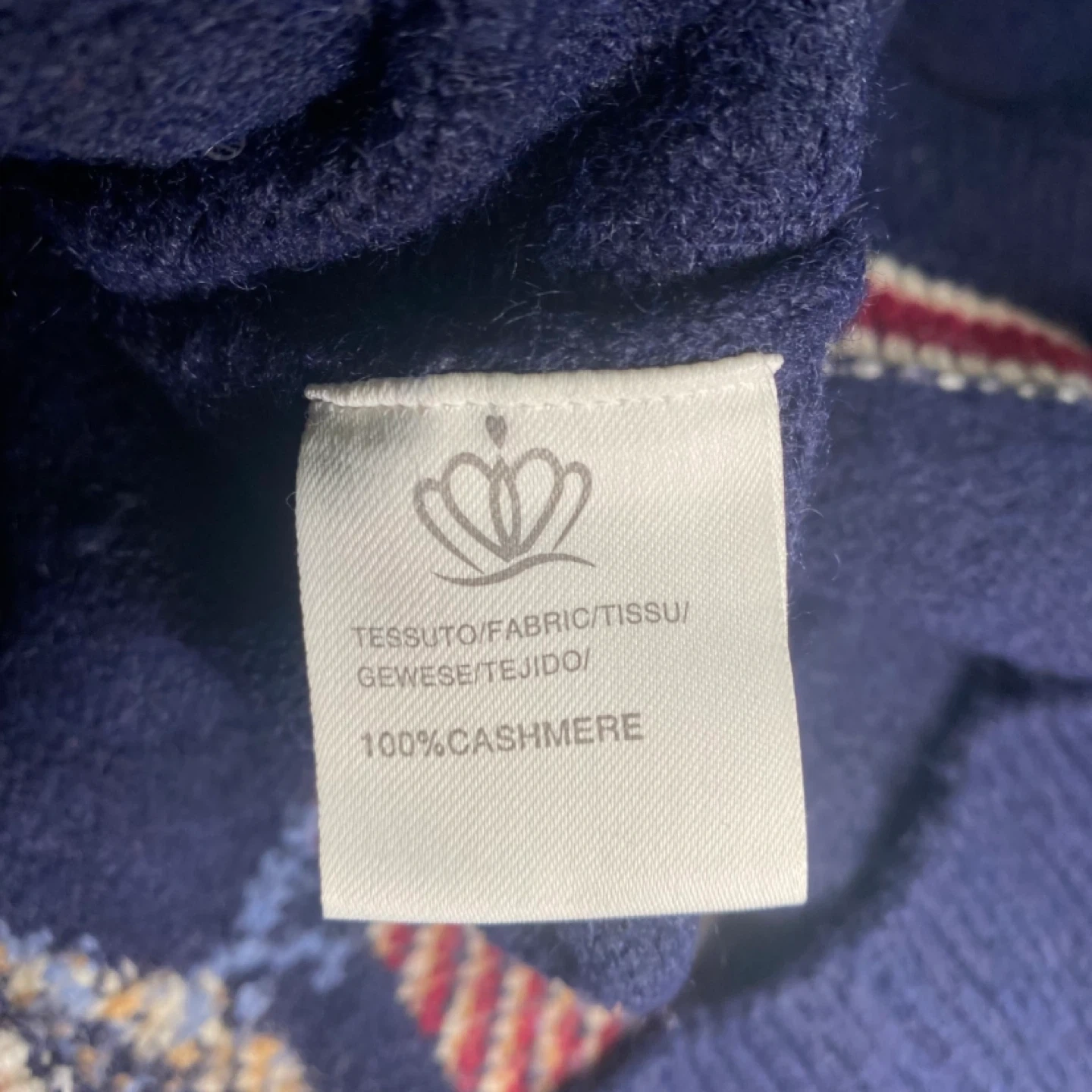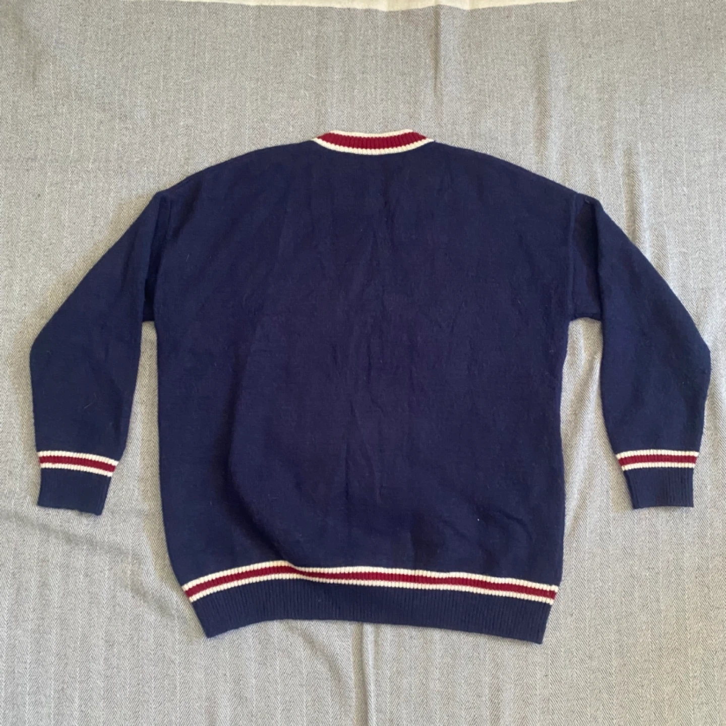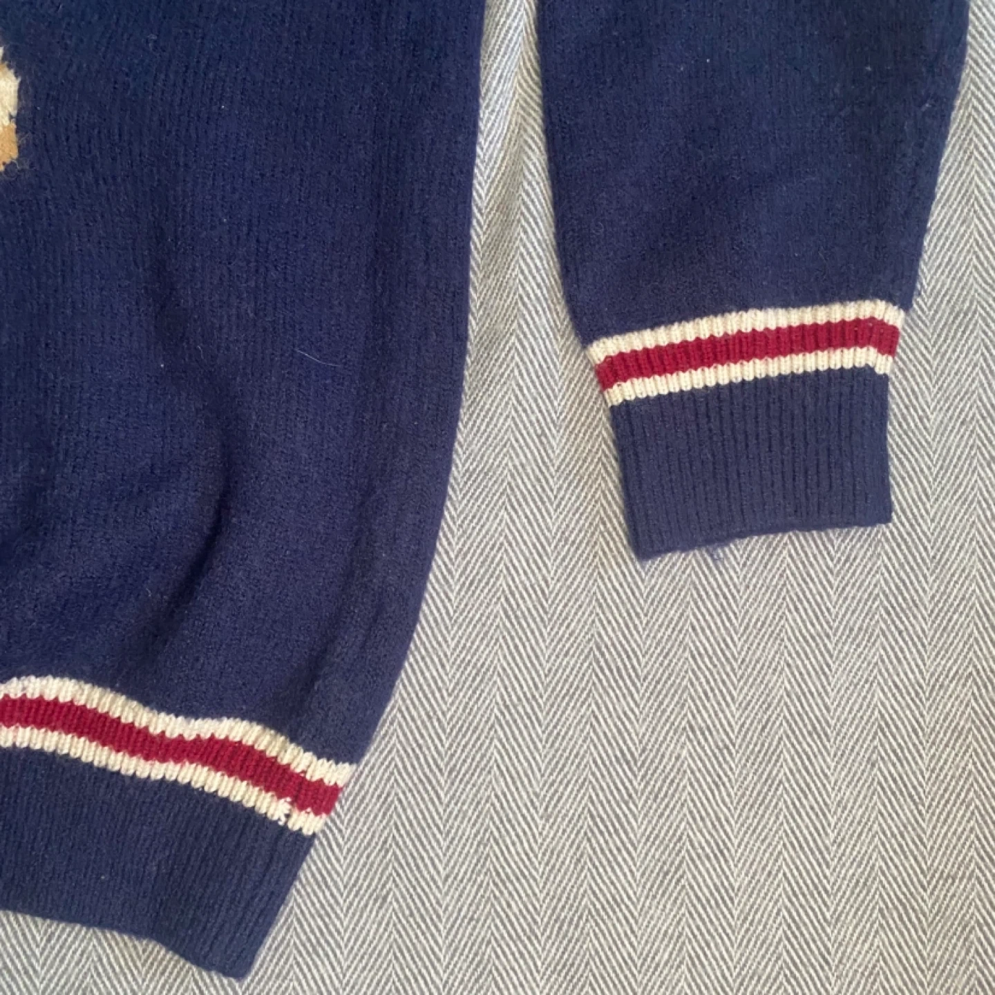 100% cashmere Navy blue sweater with a cute teddy bear graphic wearing a jacket and tie. It has striped cuffs and hem. Great for a casual, cozy look! Fits large more baggy and XL is more of a true fit