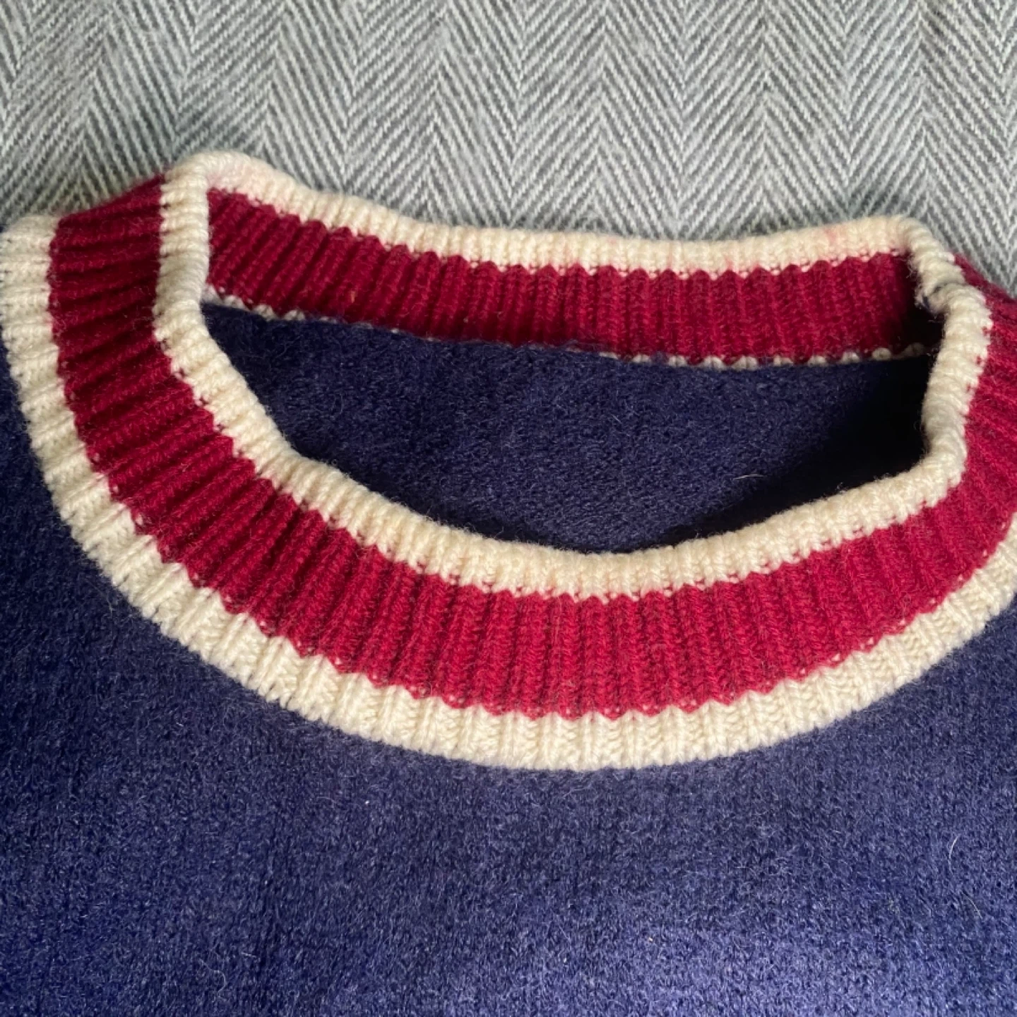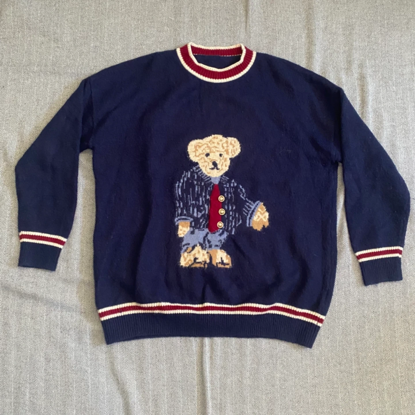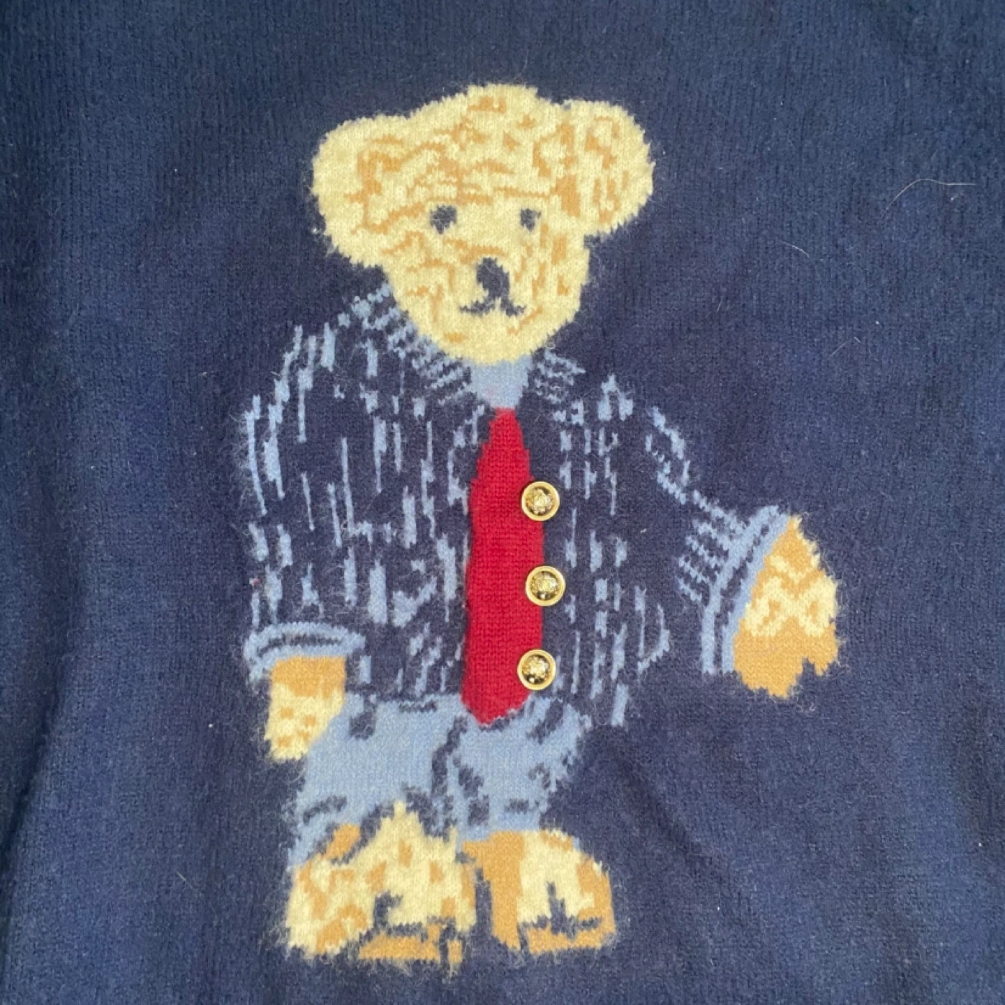 100% cashmere Navy blue sweater with a cute teddy bear graphic wearing a jacket and tie. It has striped cuffs and hem. Great for a casual, cozy look! Fits large more baggy and XL is more of a true fit
