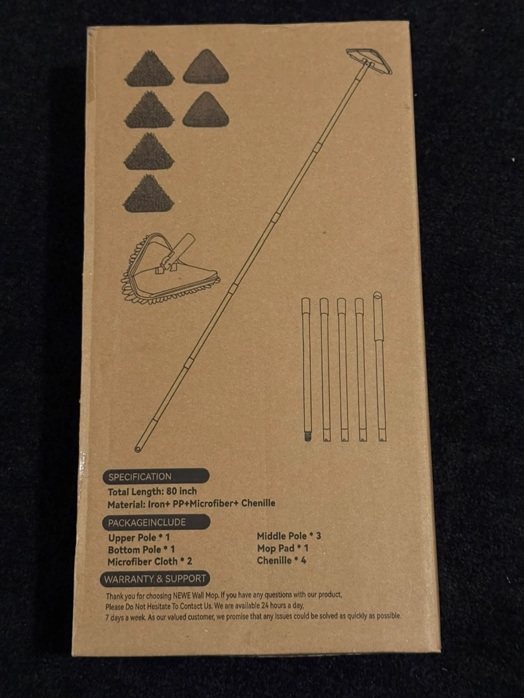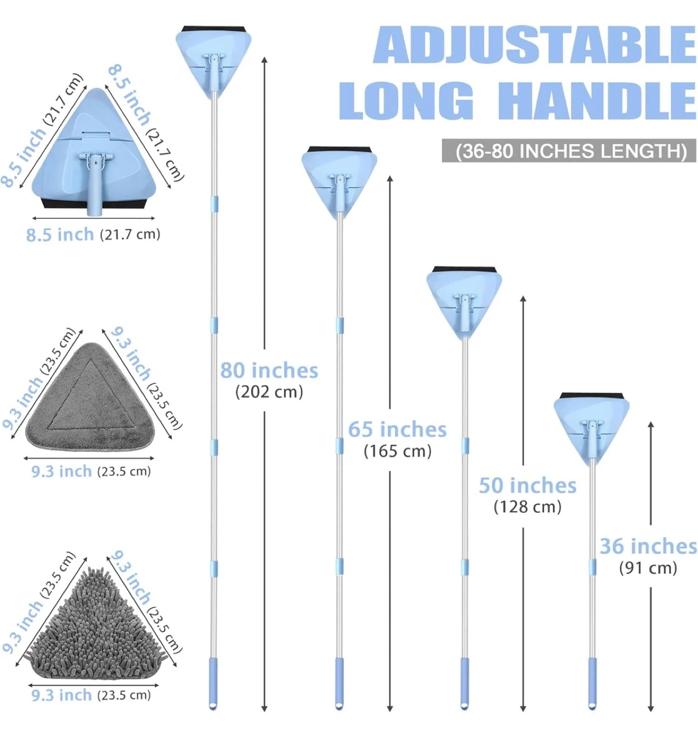 • Product Features: 80-inch long handle, 360-degree rotating head, 4 chenille pads, 2 microfiber pads, and a rubber squeegee.