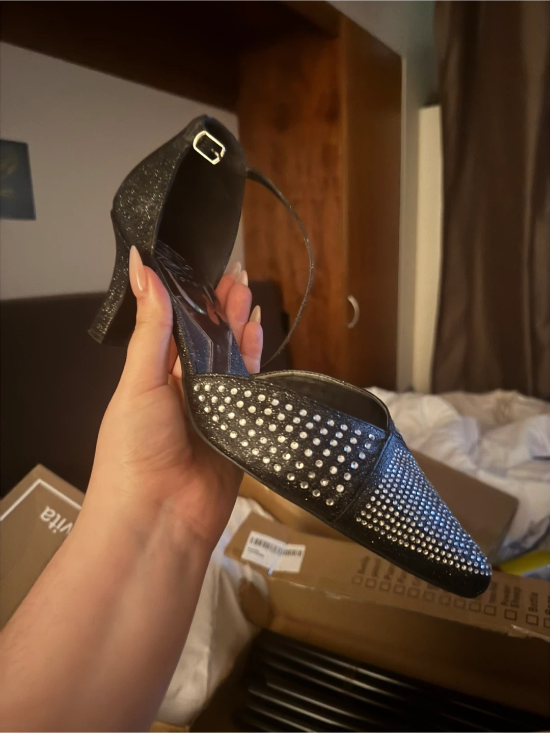These black glitter heels are adorned with sparkling rhinestones across the toe and vamp. They feature a secure ankle strap with a buckle closure. The heel is a classic stiletto shape.