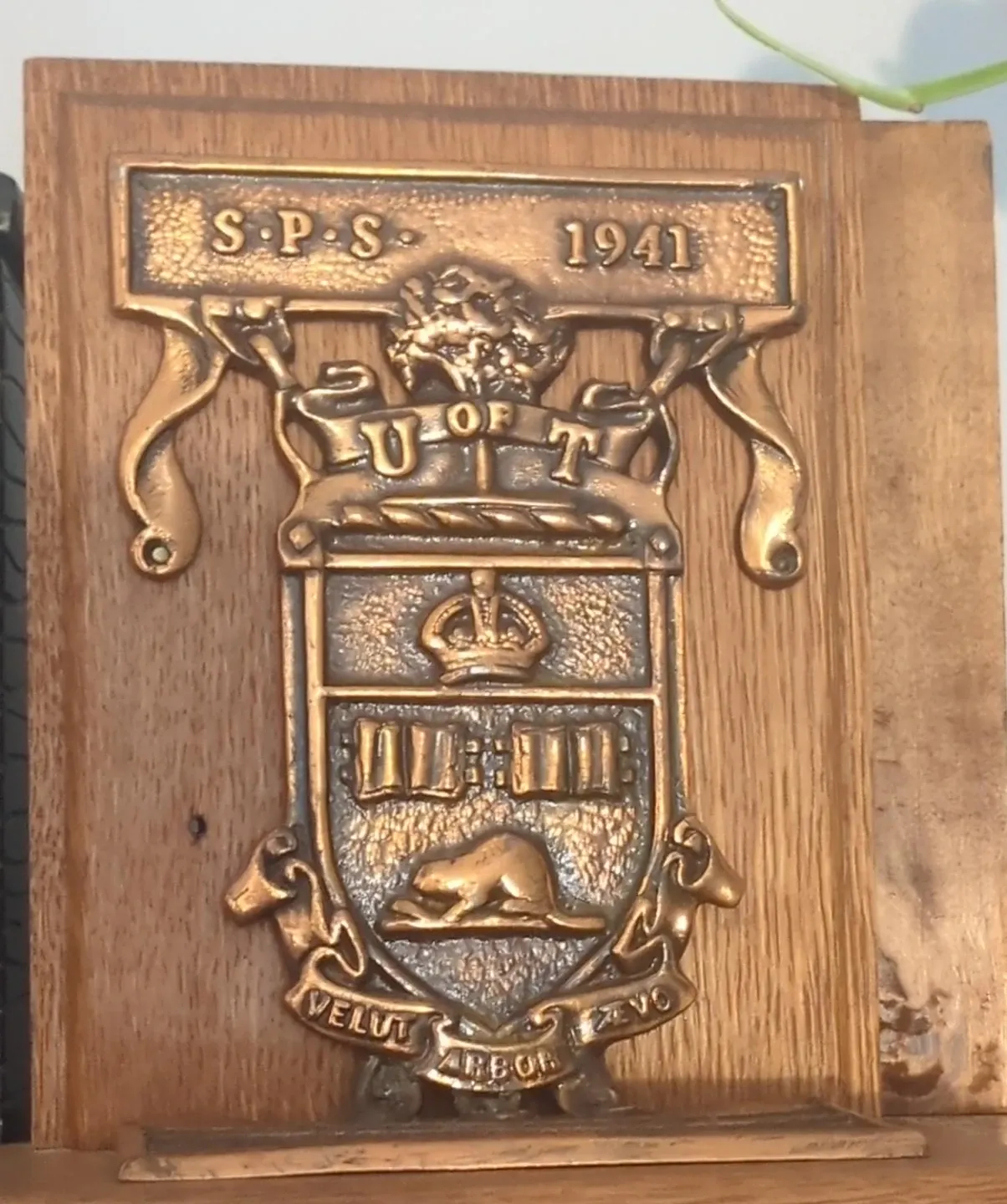 These bookends feature decorative plaques with the SPS 1941 crest and 'U of T' insignia. It's mounted on a wooden base. The crest includes a beaver and a crown emblem. Velut Arbor Aevo is inscribed on a banner.