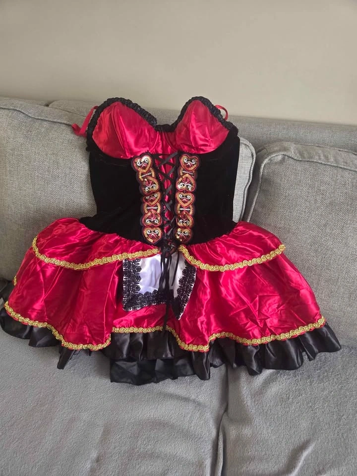 Selling a brand new, high-quality costume dress. Perfect for Halloween, cosplay, or themed parties. Although the tag says XL, this costume runs small and fits more like a Medium (M) or Large (L). The adjustable corset lacing at the front helps provide a perfect fit for these sizes. Beautiful combination of red satin and black velvet with gold trim and a lace-edged apron. Brand new, never worn. Flattering corset-style top with a flared ruffled skirt. Thick, premium fabric (Velour/Satin mix), much better than standard store-bought costumes.