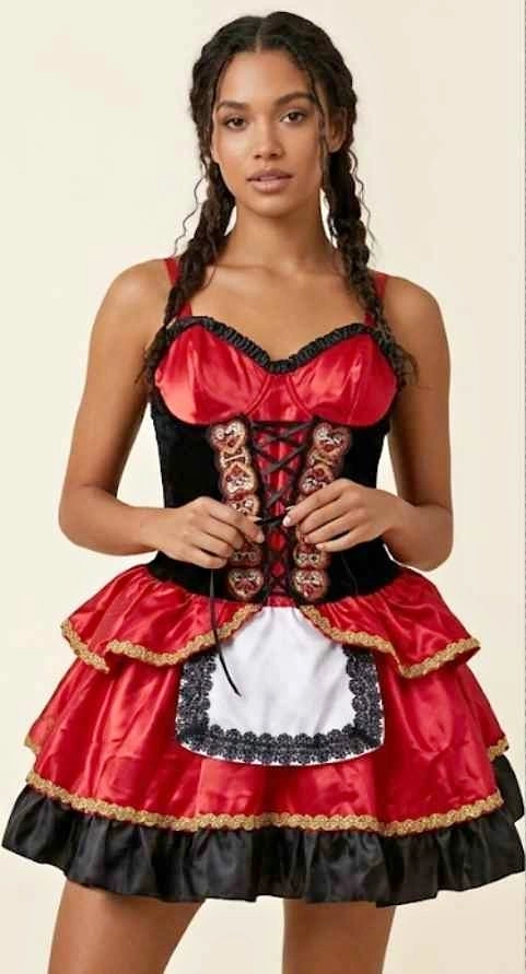 Selling a brand new, high-quality costume dress. Perfect for Halloween, cosplay, or themed parties. Although the tag says XL, this costume runs small and fits more like a Medium (M) or Large (L). The adjustable corset lacing at the front helps provide a perfect fit for these sizes. Beautiful combination of red satin and black velvet with gold trim and a lace-edged apron. Brand new, never worn. Flattering corset-style top with a flared ruffled skirt. Thick, premium fabric (Velour/Satin mix), much better than standard store-bought costumes.
