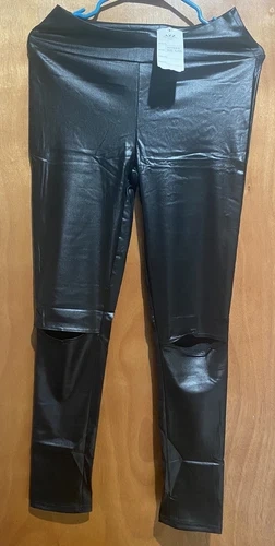 Lady leather pants with openings at the knees, shiny black. Size XL/XXL. Feel free to message if you have any questions!