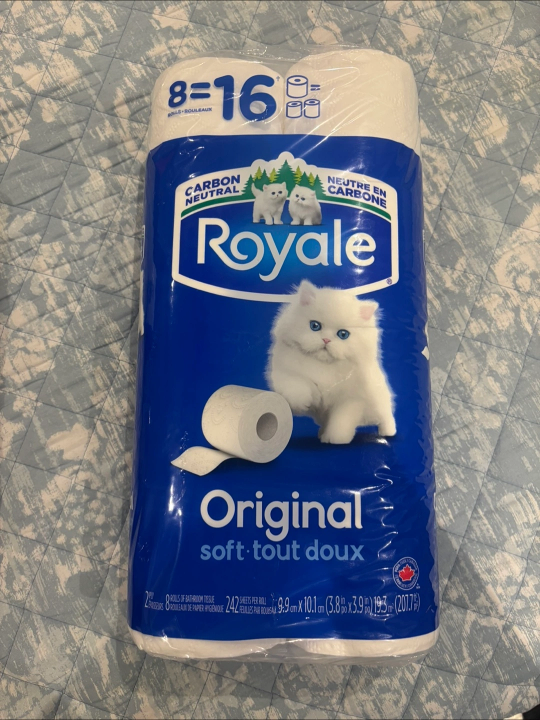 This is a 16-roll pack of Royale Original soft toilet paper. It's 2-ply with 242 sheets per roll. The paper is 9.9cm x 10.1cm.
