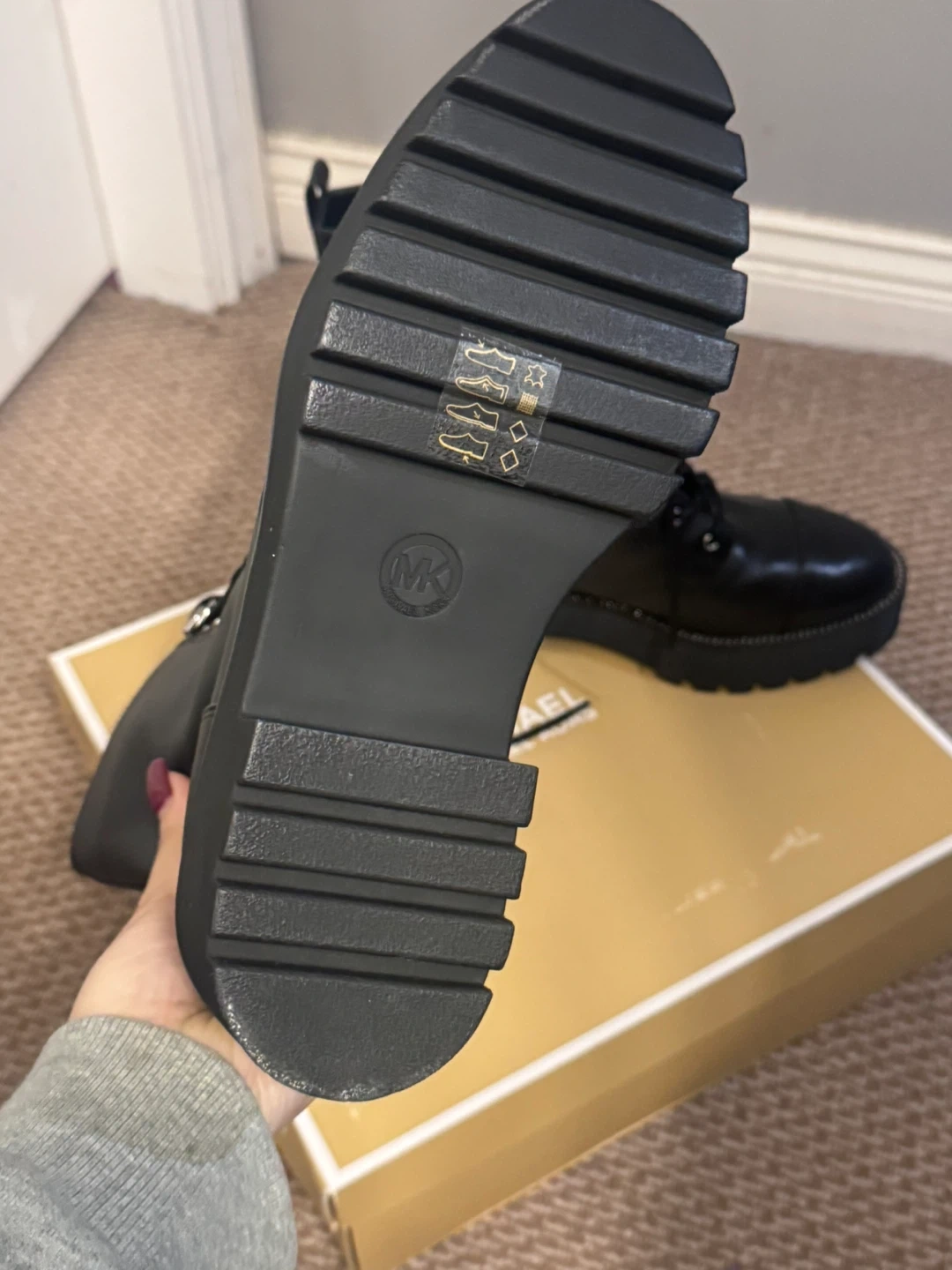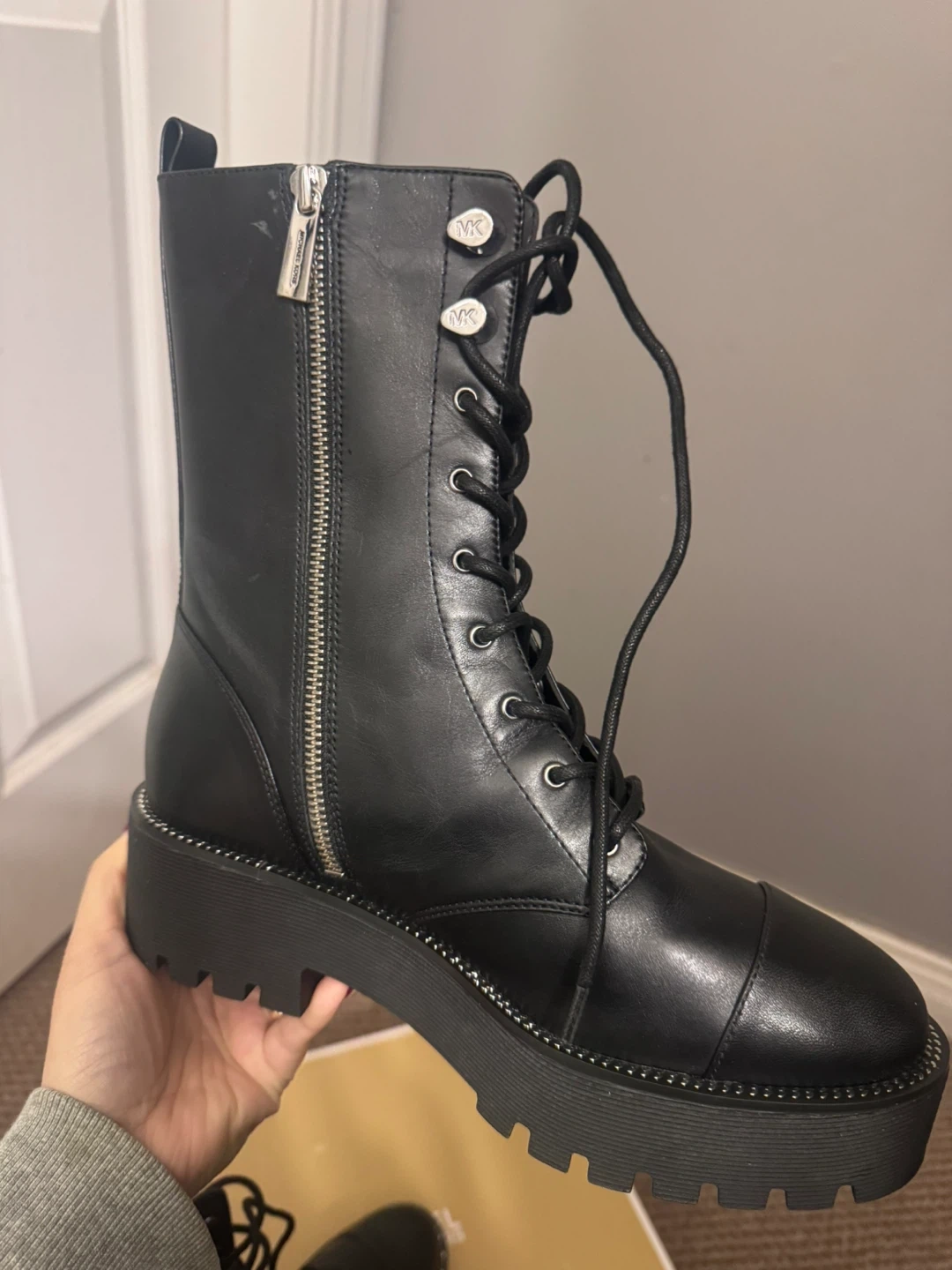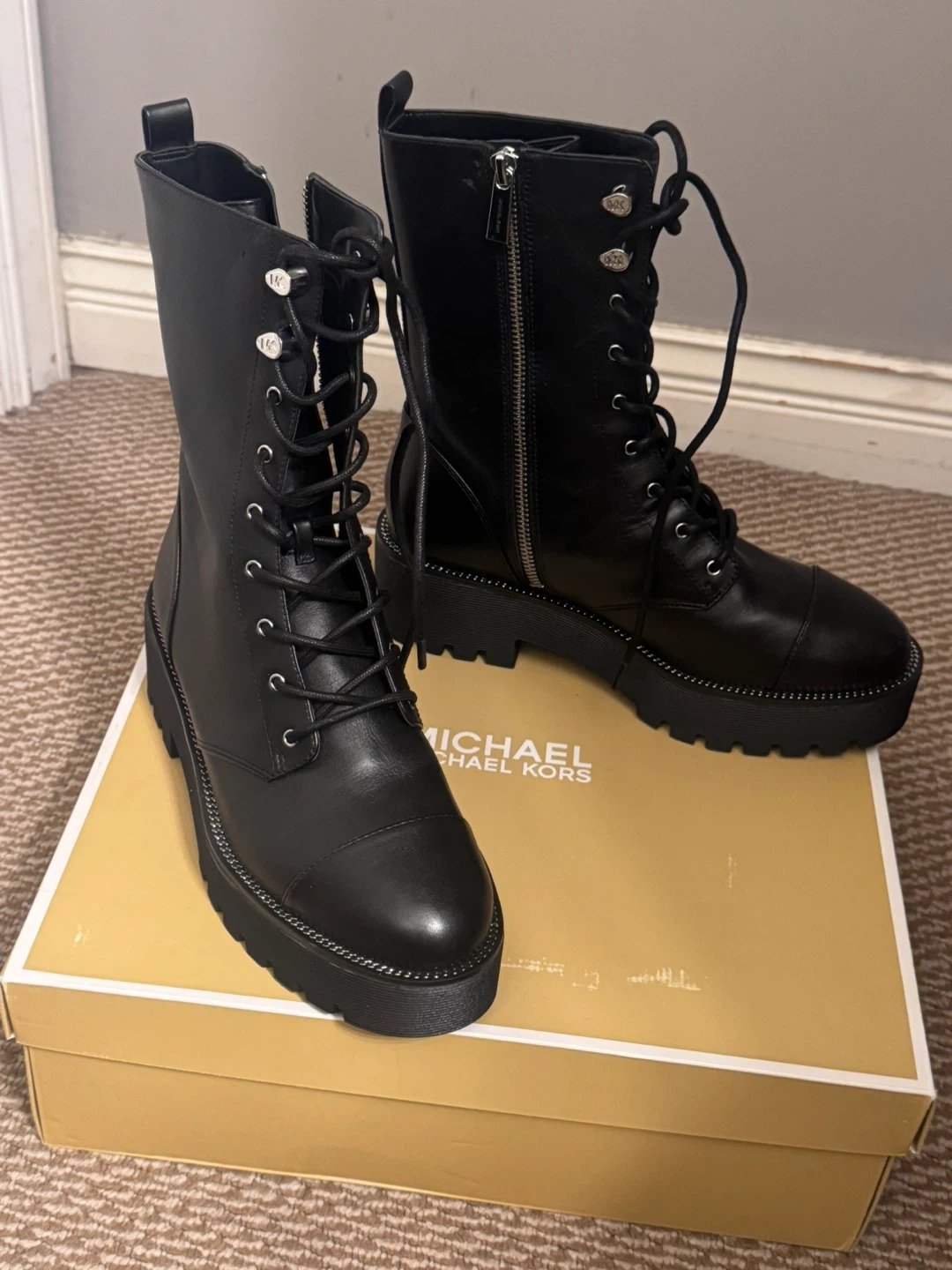These Michael Kors boots are crafted from black leather. They feature a lace-up front and a side zipper for easy on and off. The platform sole adds a stylish edge. Includes original box.