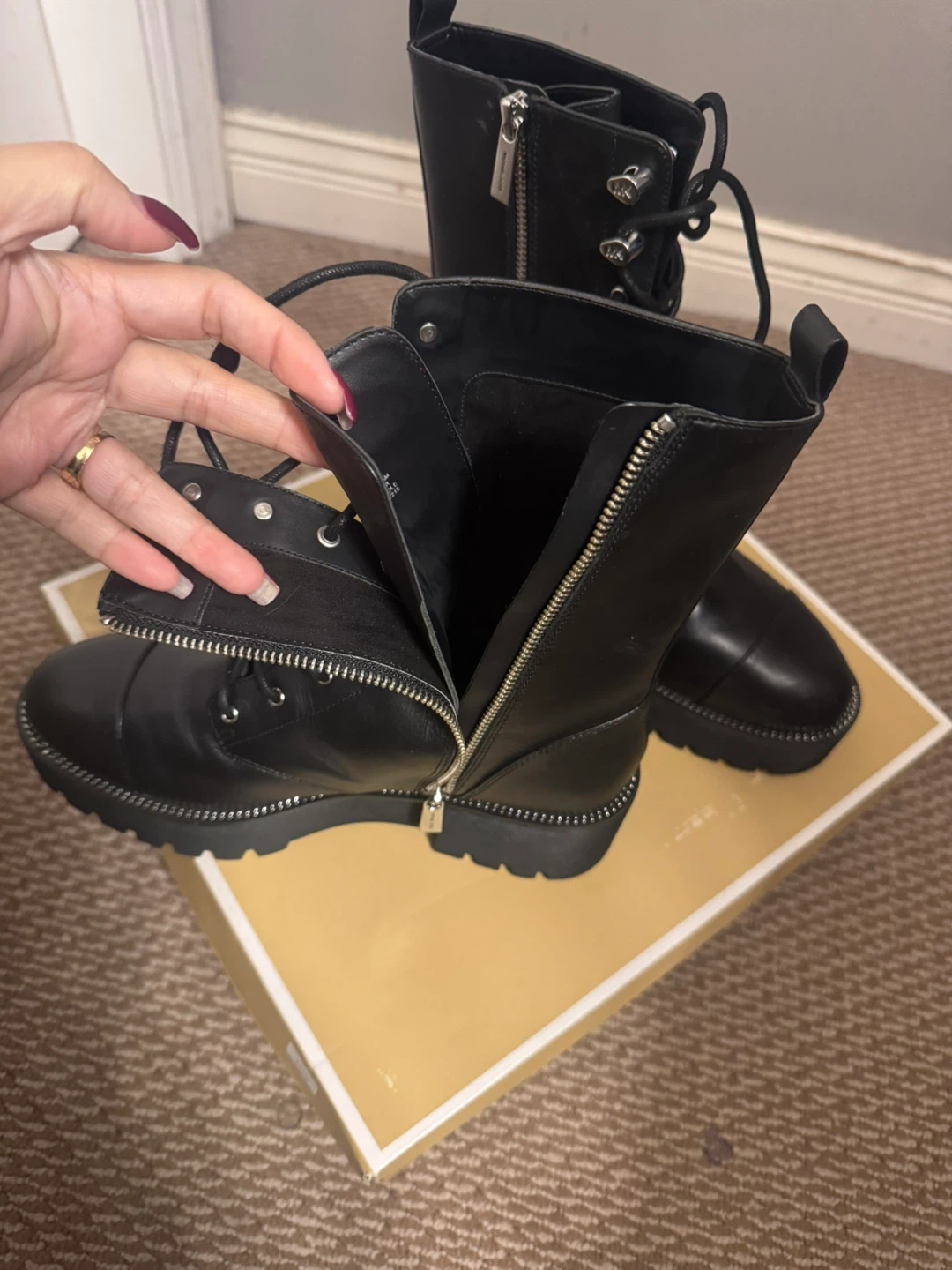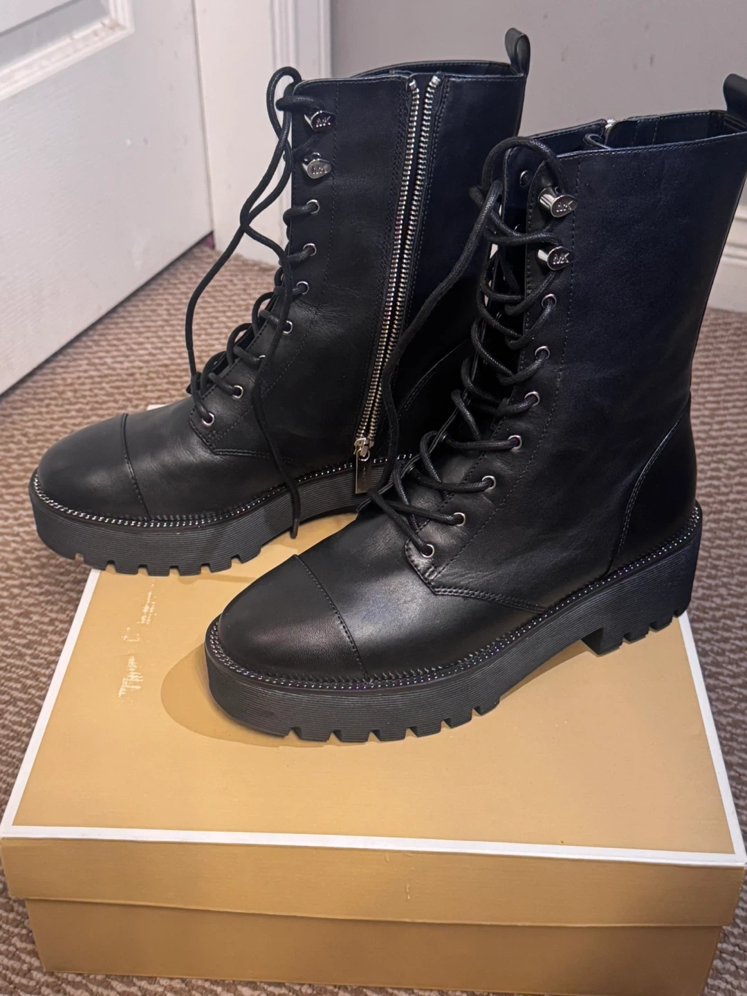 These Michael Kors boots are crafted from black leather. They feature a lace-up front and a side zipper for easy on and off. The platform sole adds a stylish edge. Includes original box.
