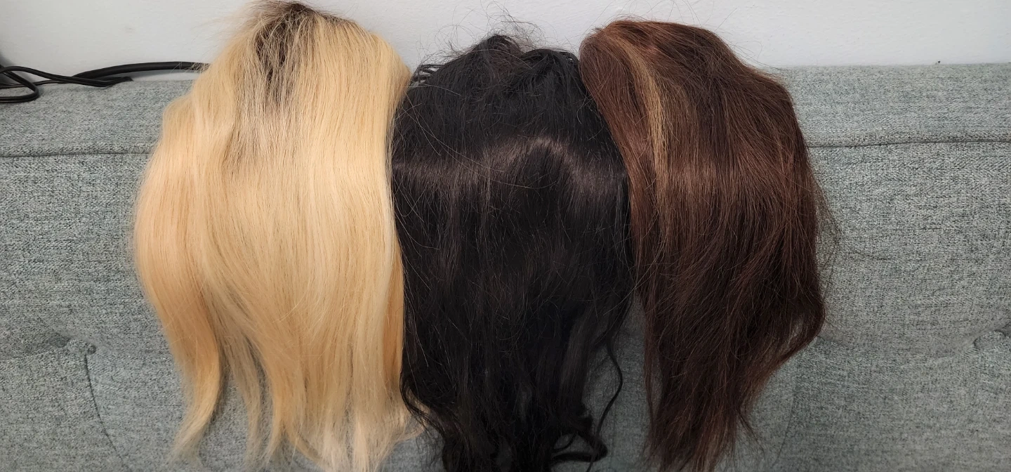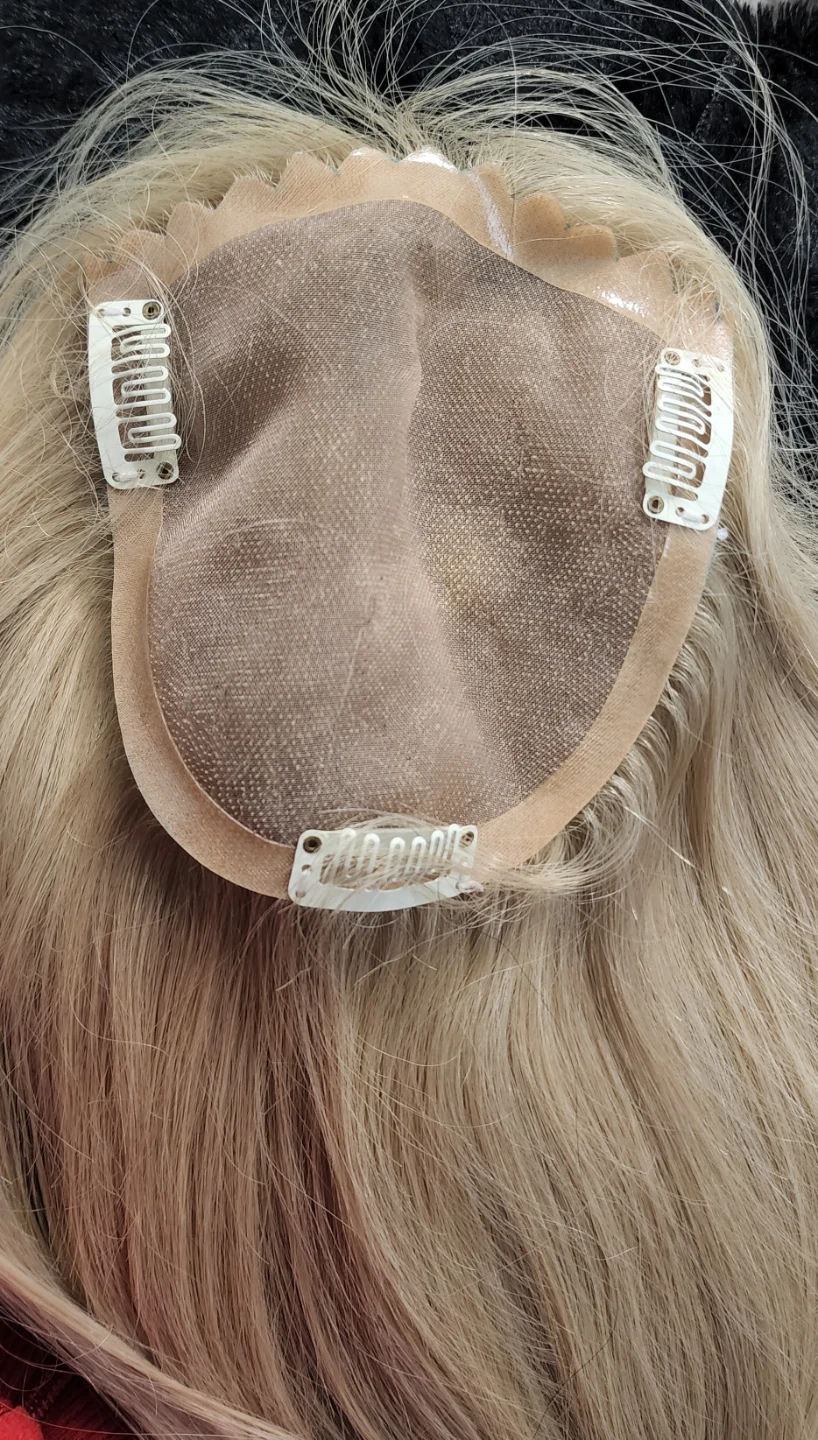 This is a blonde hair topper, designed for clip-in application. Can be dyed and styled as it's a natural hair. It provides natural-looking volume and coverage. The base is a breathable mesh with secure clips attached.