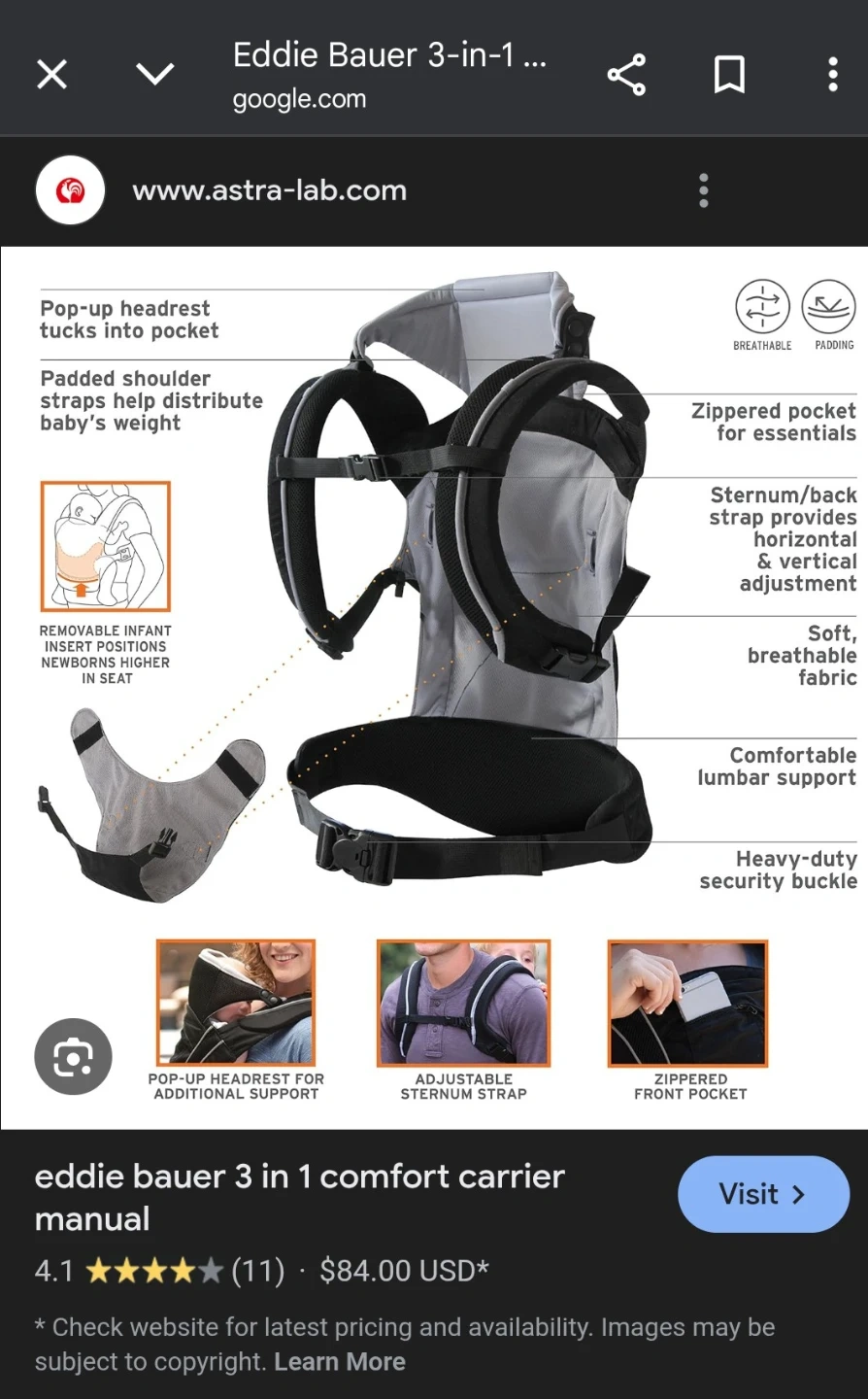I'm selling an Eddie Bauer baby carrier in black. It's in great condition and ready for a new little one! Perfect for keeping your baby close and comfortable while you're on the go